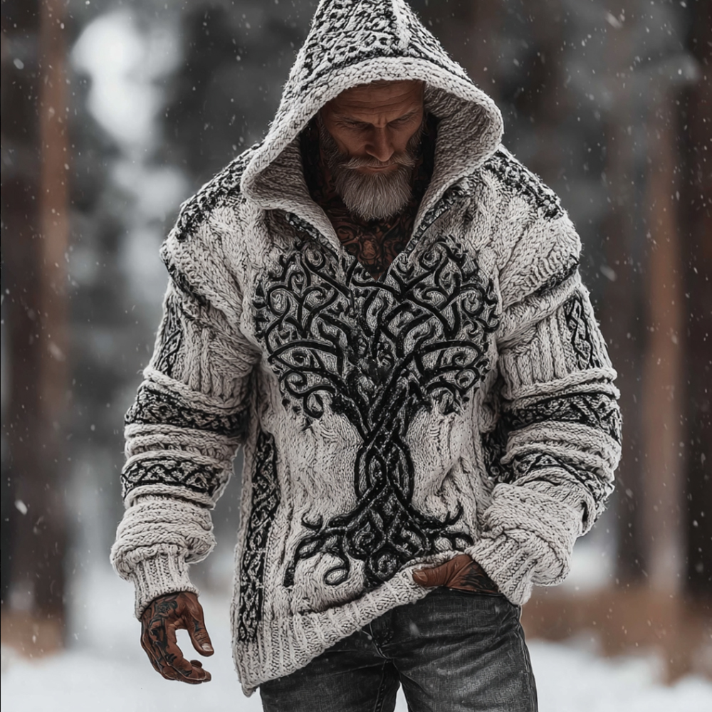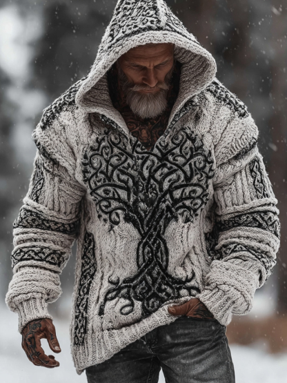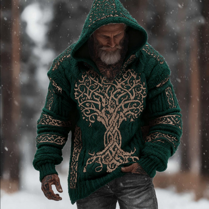 Men's Viking Style Flowering Tree Of Life Warm Thick Needle Hooded Sweater