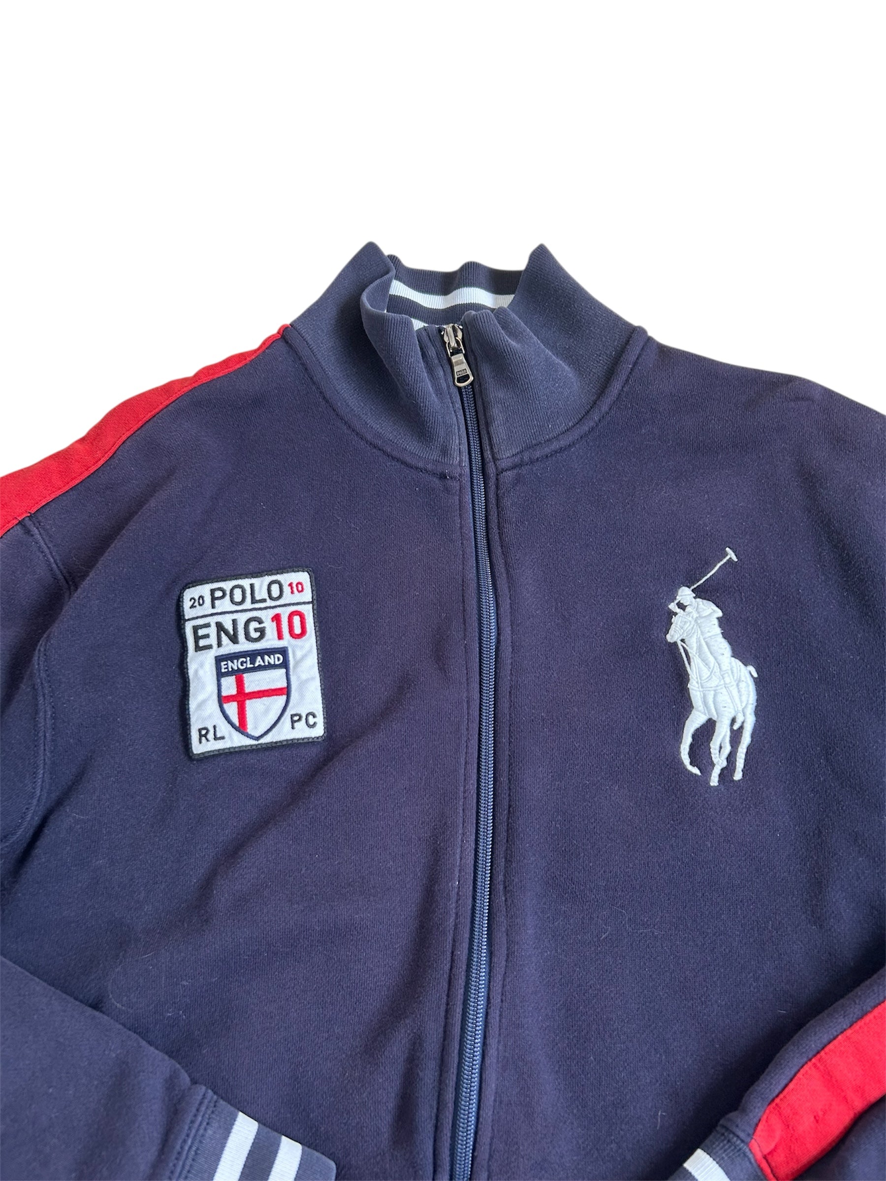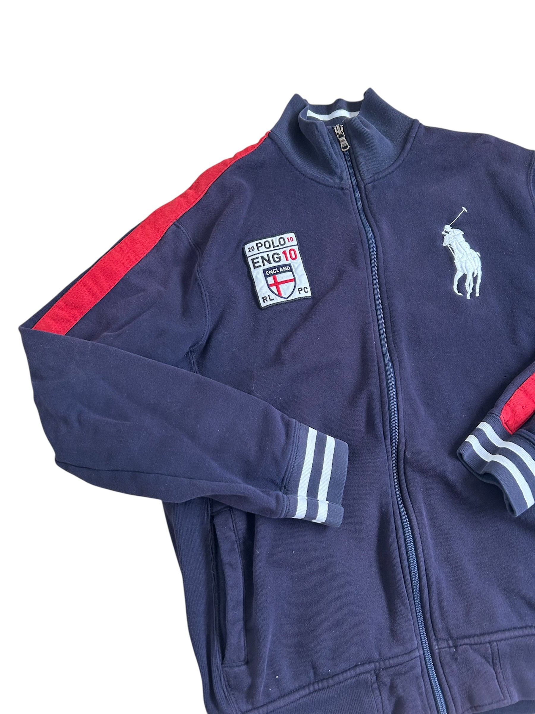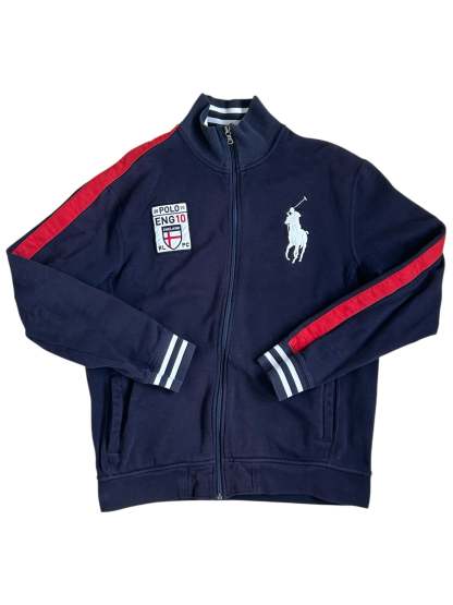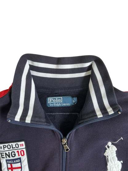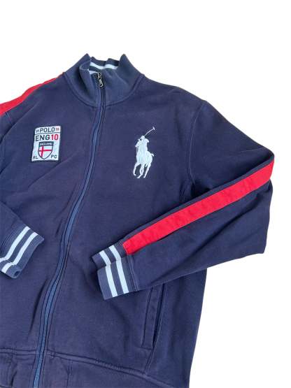Made from a 100% high-quality cotton, it features the Big Pony logo, an embroidered England team crest, and a full-zip design with sporty white stripe detailing on the sleeves. No longer in production, making it a rare and sought-after item for Ralph Lauren enthusiasts.