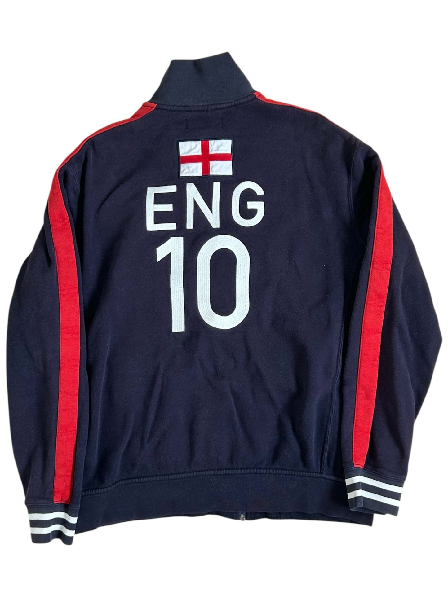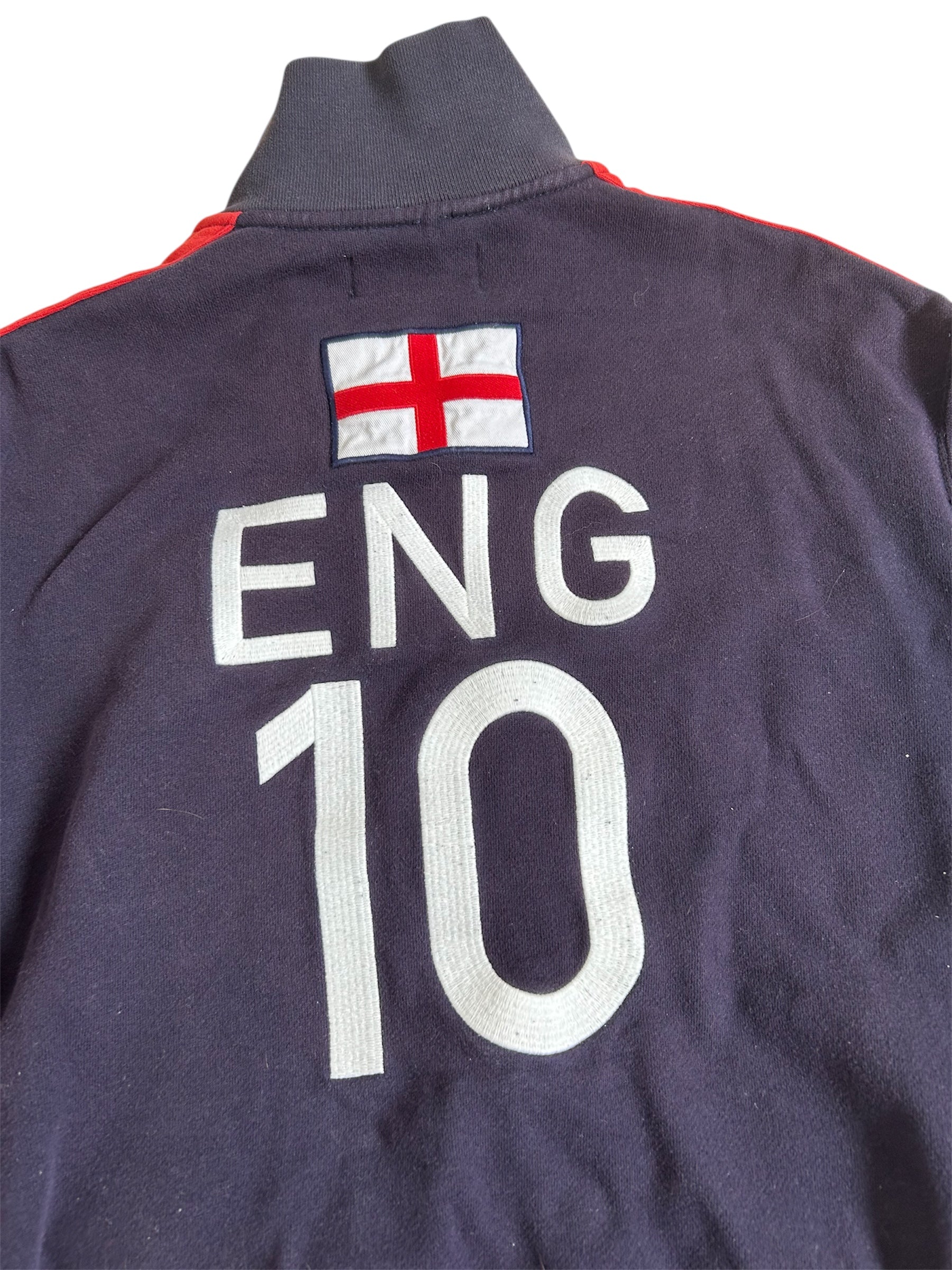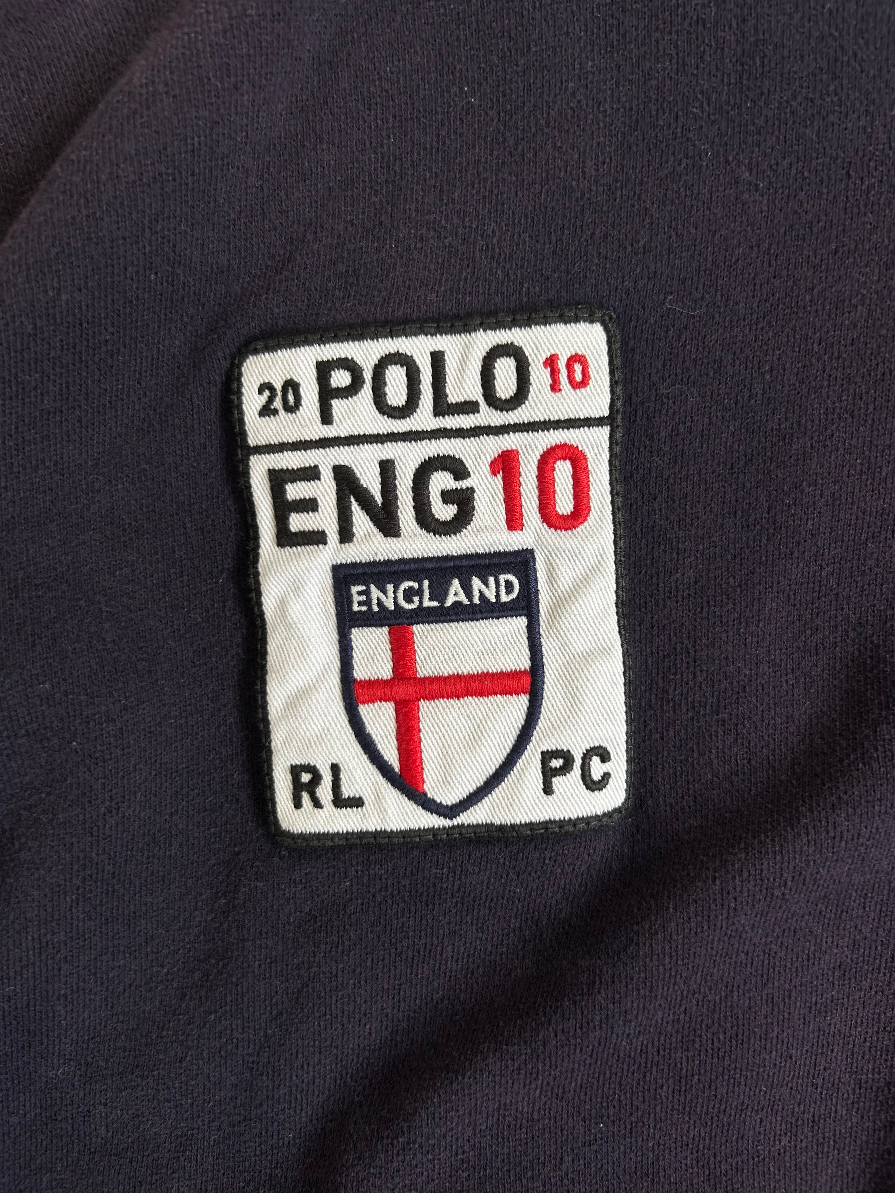 Made from a 100% high-quality cotton, it features the Big Pony logo, an embroidered England team crest, and a full-zip design with sporty white stripe detailing on the sleeves. No longer in production, making it a rare and sought-after item for Ralph Lauren enthusiasts.