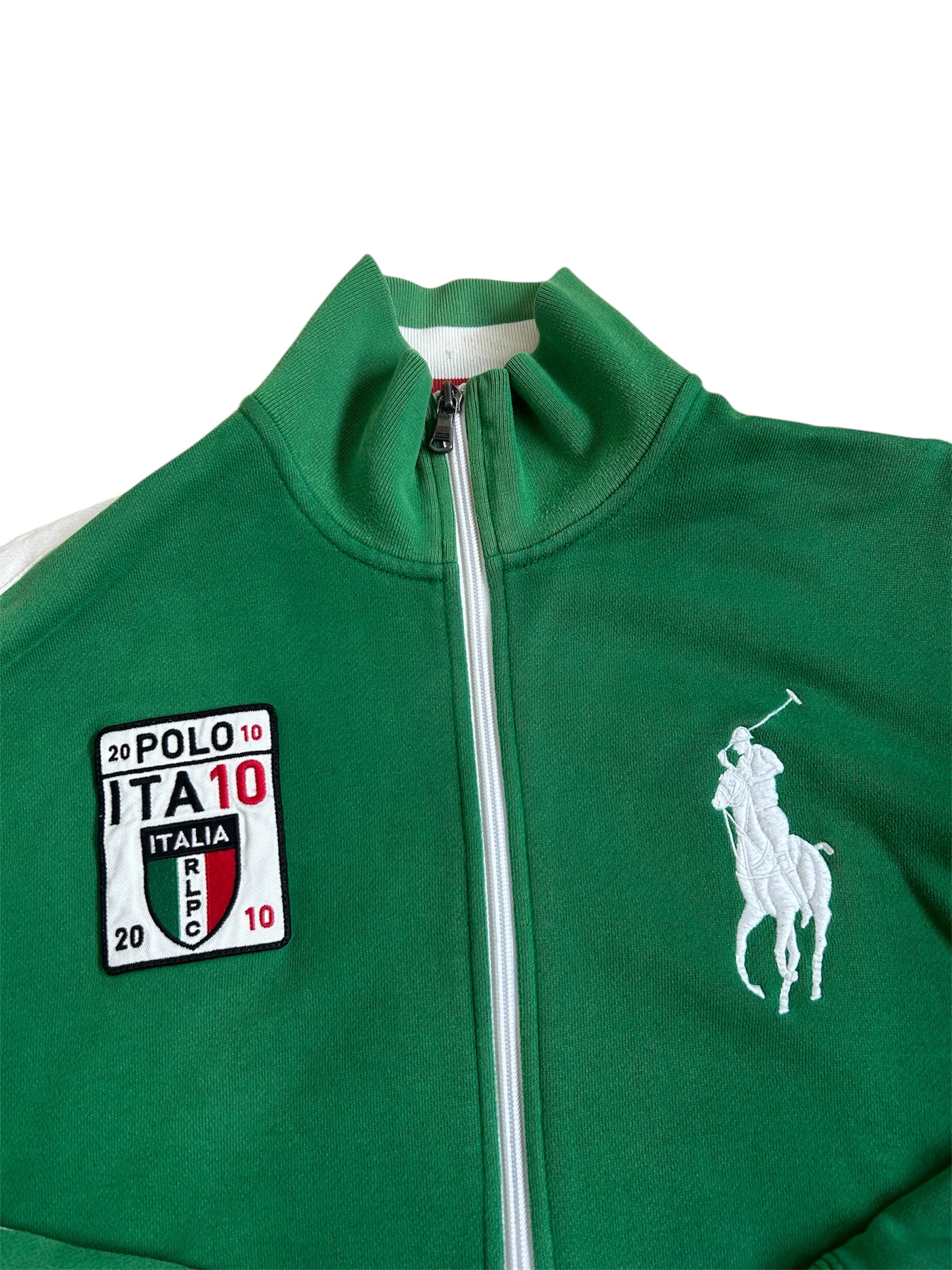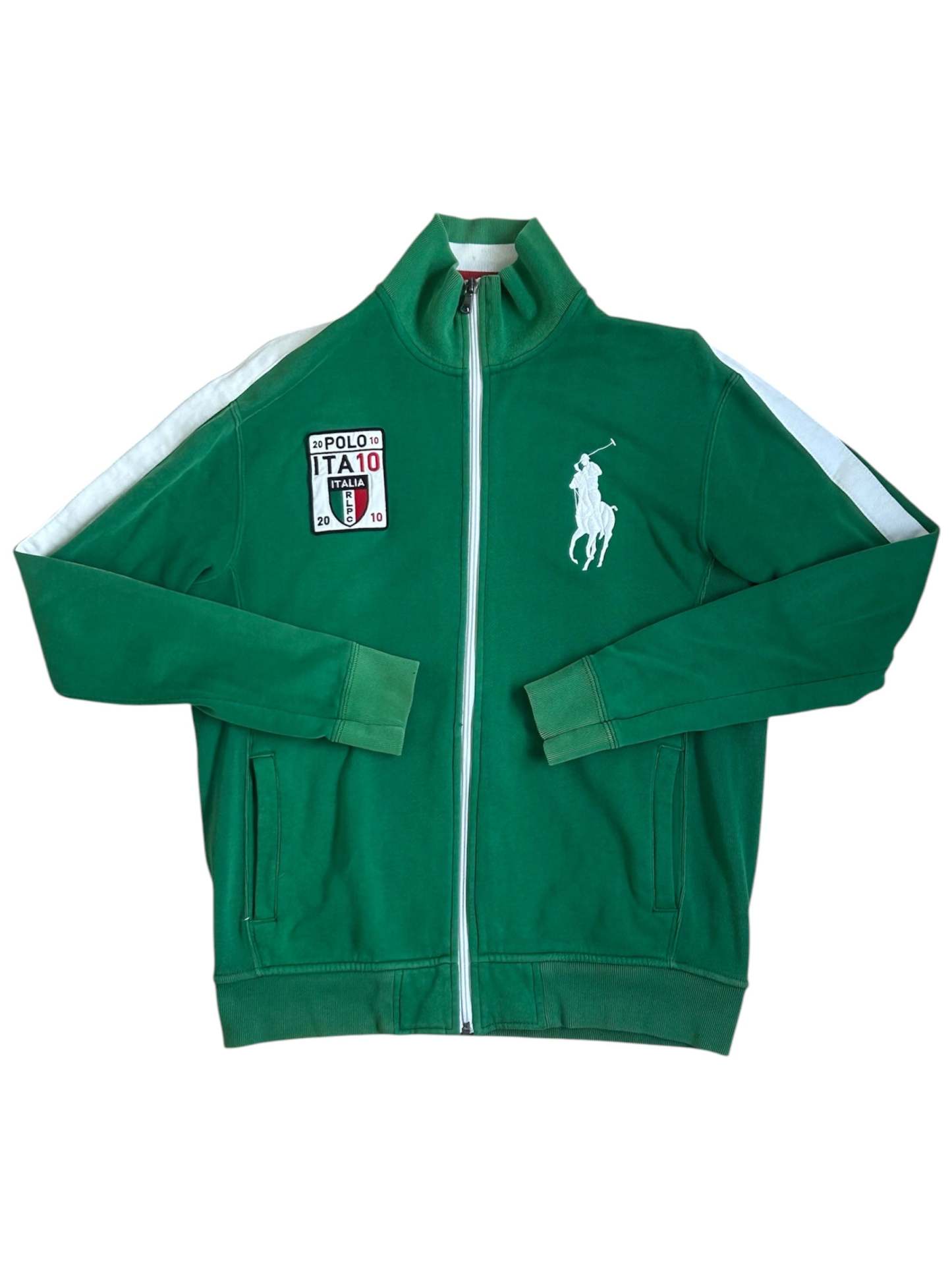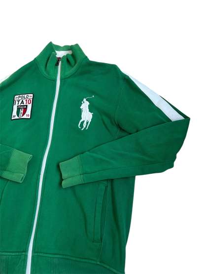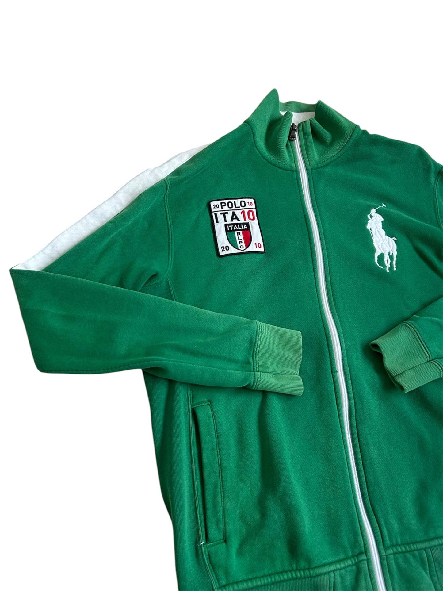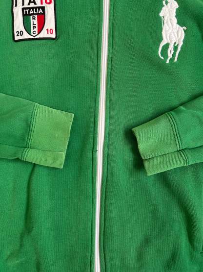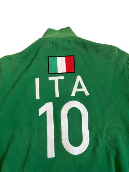 Made from a 100% high-quality cotton, it features the Big Pony logo, an embroidered Italy team crest, and a full-zip design with sporty white stripe detailing on the sleeves. The green colorway represents the Italian national colors, adding to its authentic and collectible appeal. No longer in production, making it a rare and sought-after item for Ralph Lauren enthusiasts.