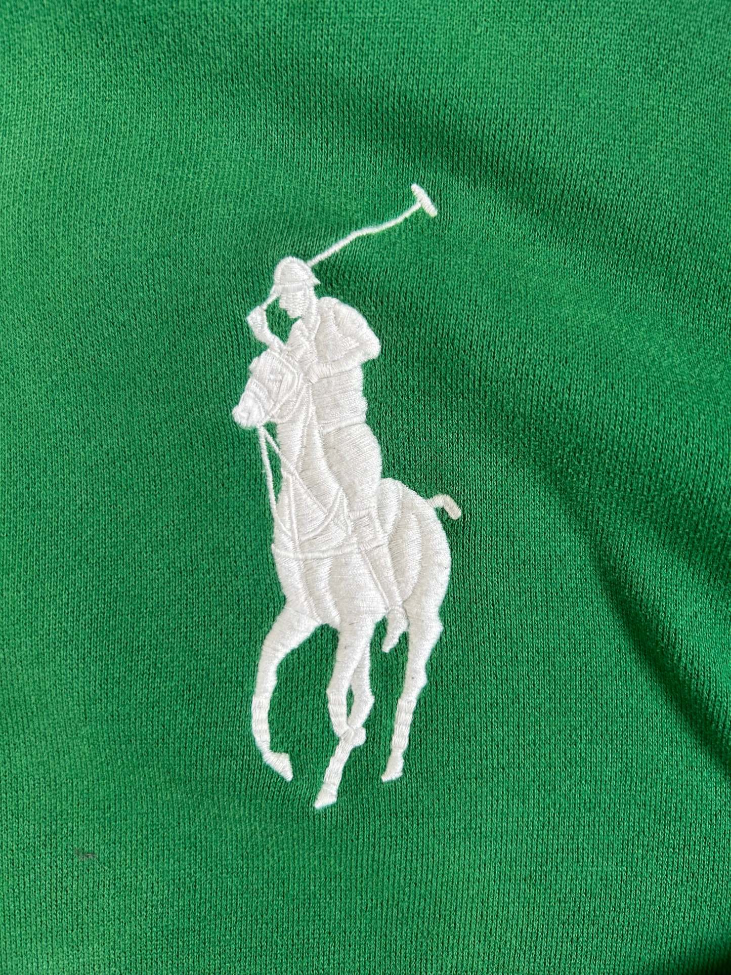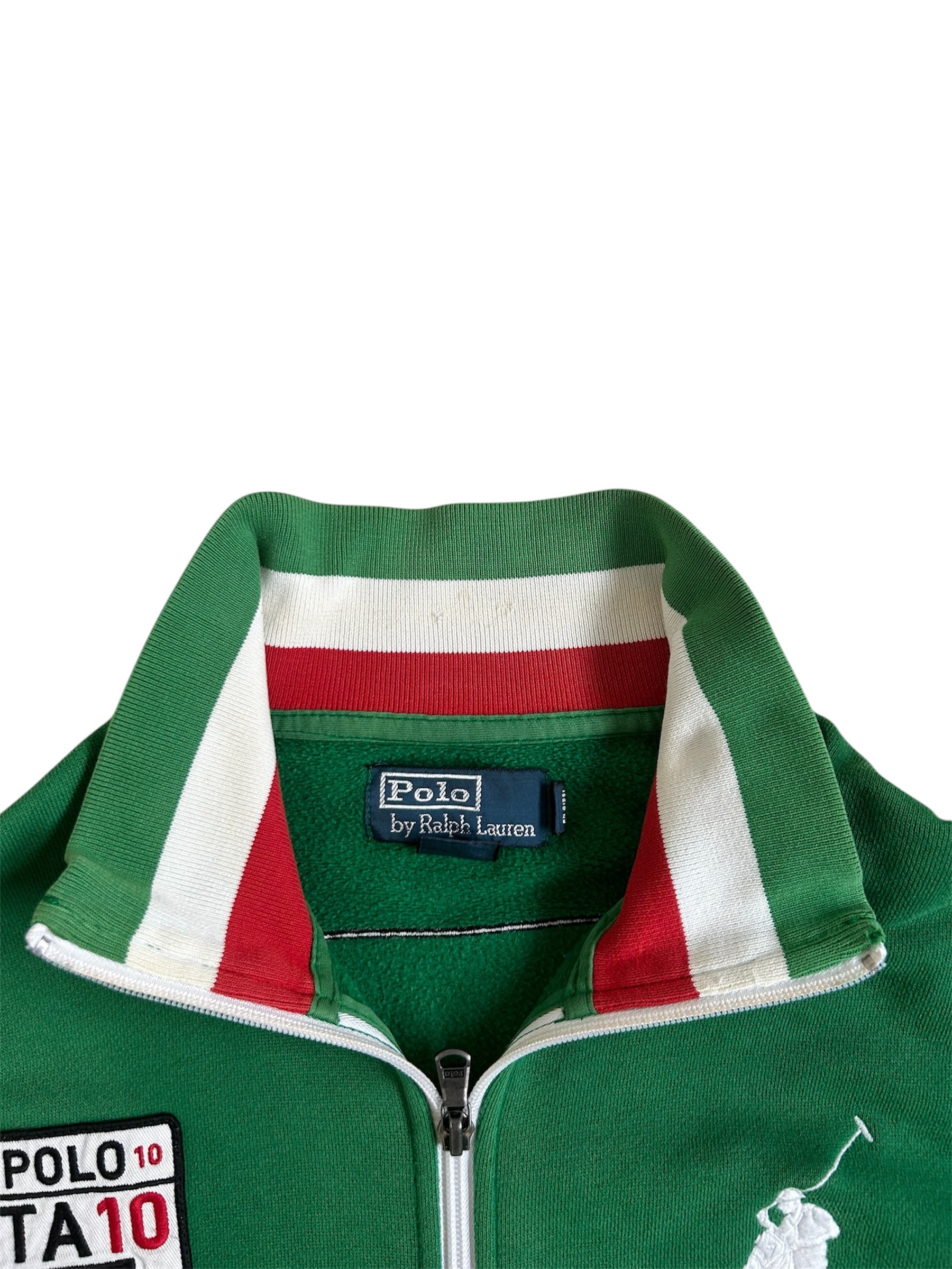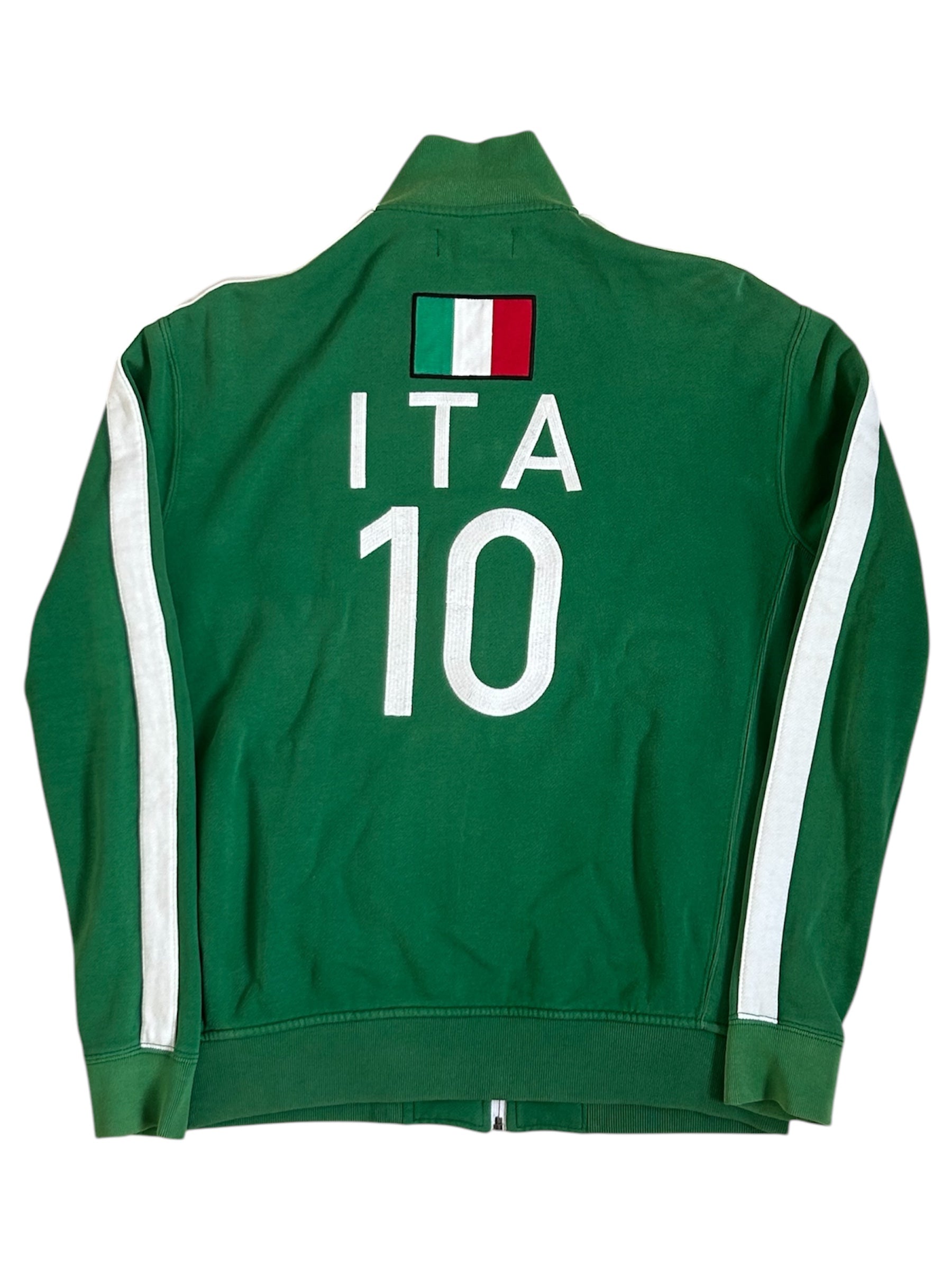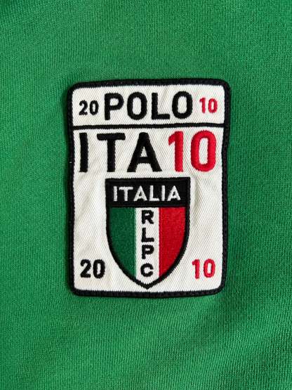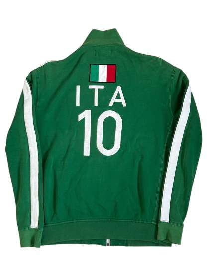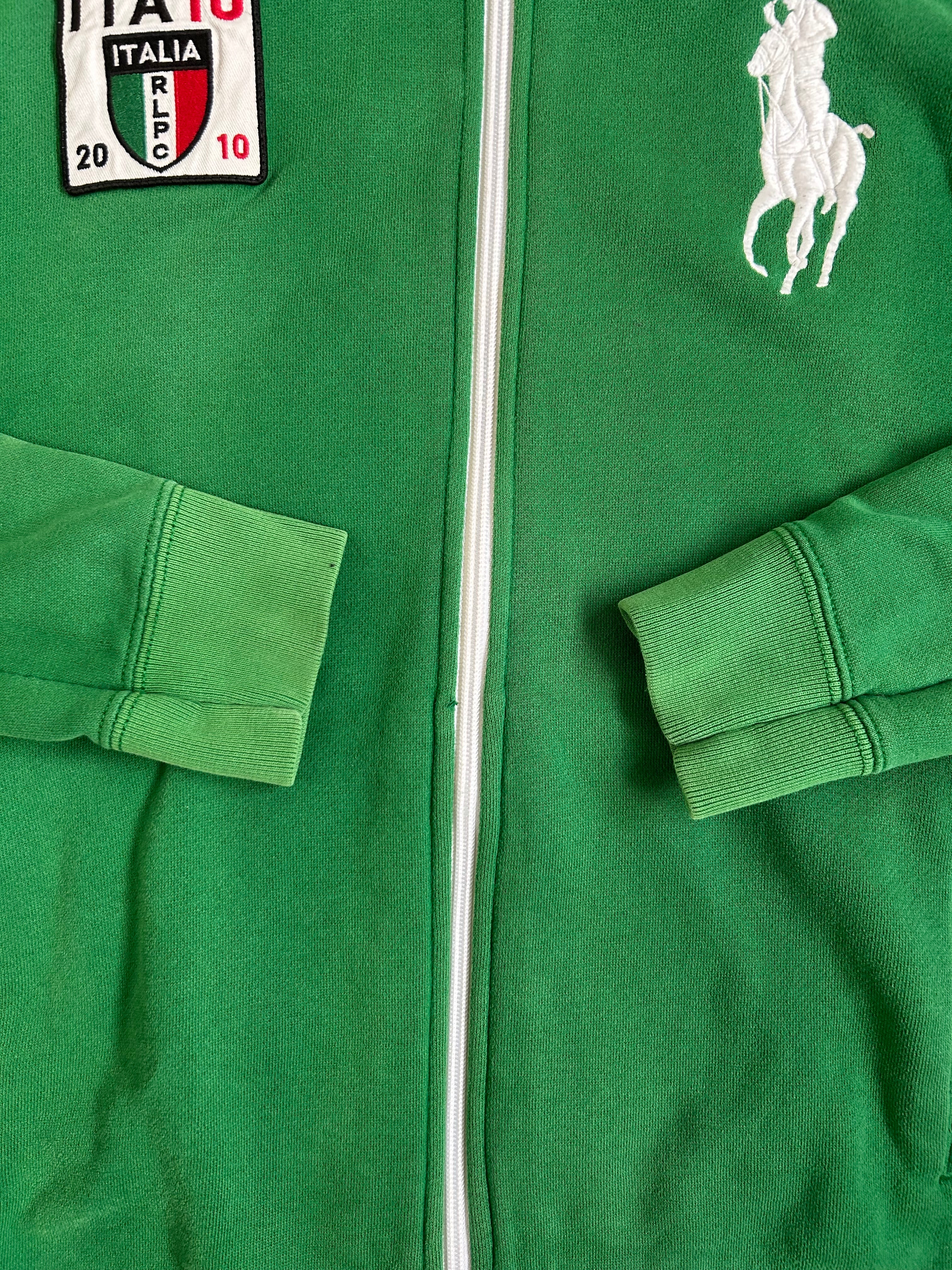 Made from a 100% high-quality cotton, it features the Big Pony logo, an embroidered Italy team crest, and a full-zip design with sporty white stripe detailing on the sleeves. The green colorway represents the Italian national colors, adding to its authentic and collectible appeal. No longer in production, making it a rare and sought-after item for Ralph Lauren enthusiasts.