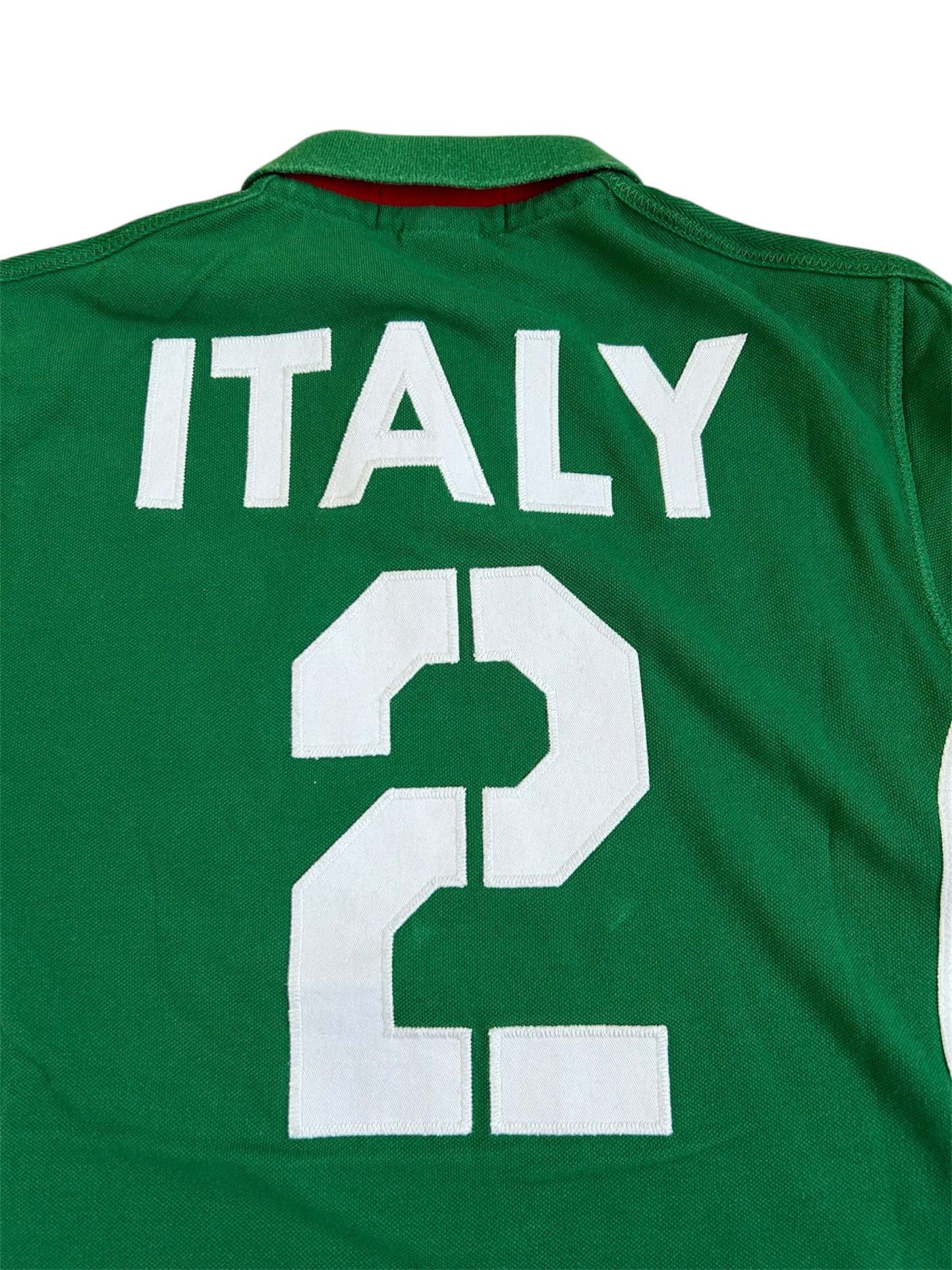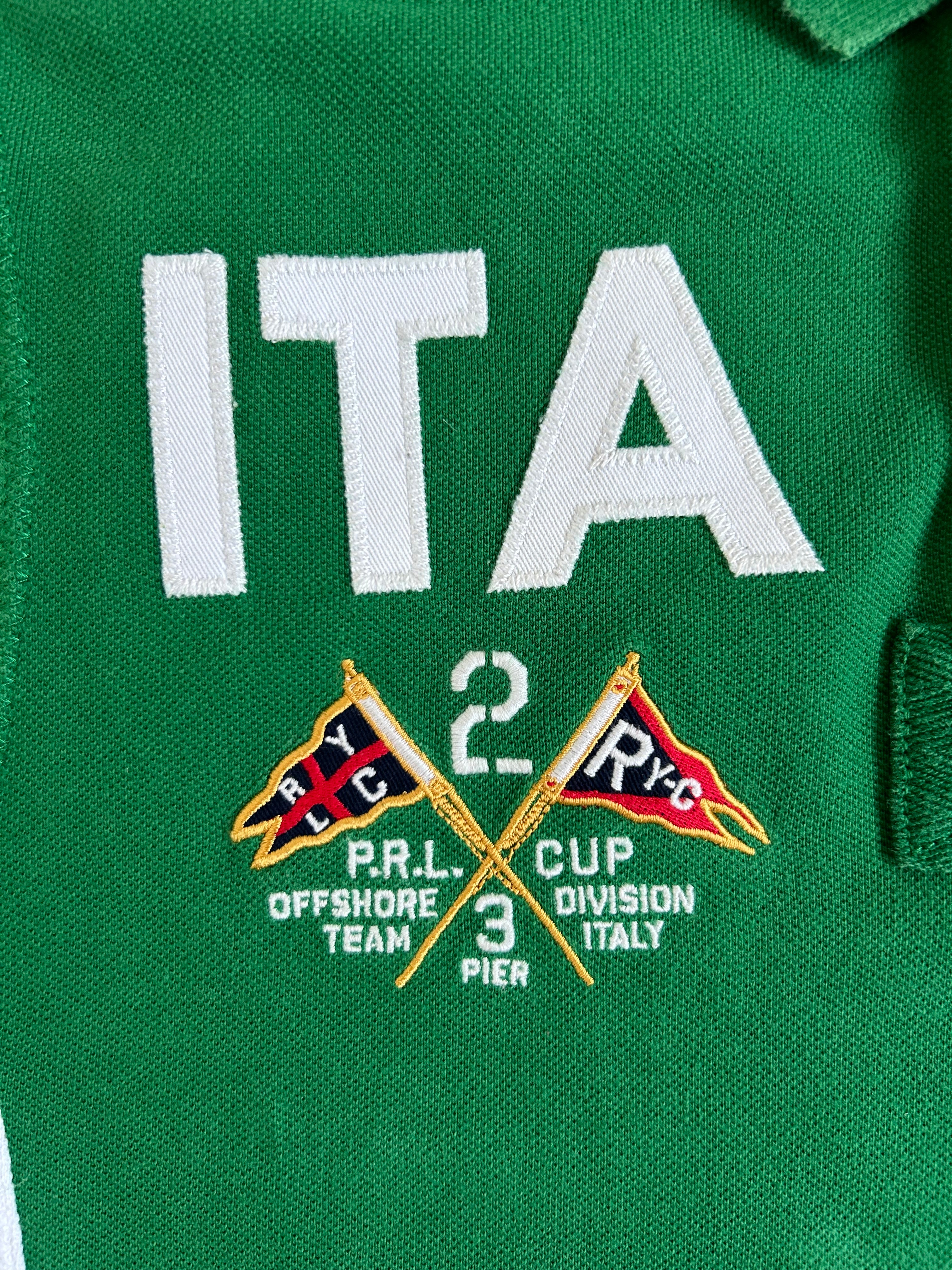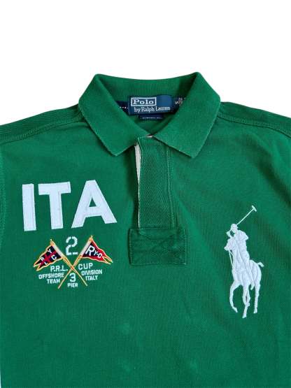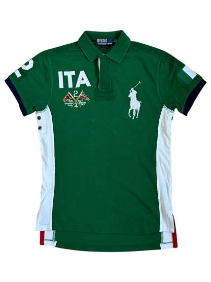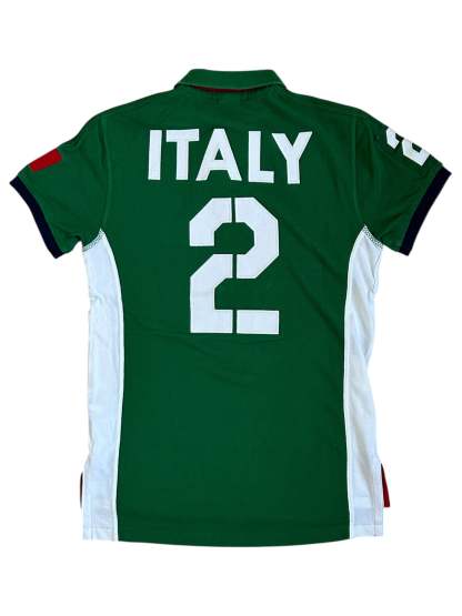 Made from 100% high-quality cotton, it features the Big Pony logo, bold "ITA" lettering, an embroidered Italy team crest, and the number 3 on the sleeve—a signature detail in Ralph Lauren’s polo designs. The green, white, and red color scheme represents the Italian national colors, adding to its authentic and collectible appeal. No longer in production, making it a rare and sought-after item for Ralph Lauren enthusiasts.