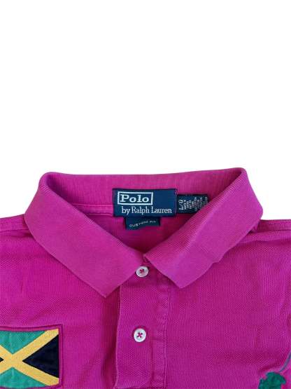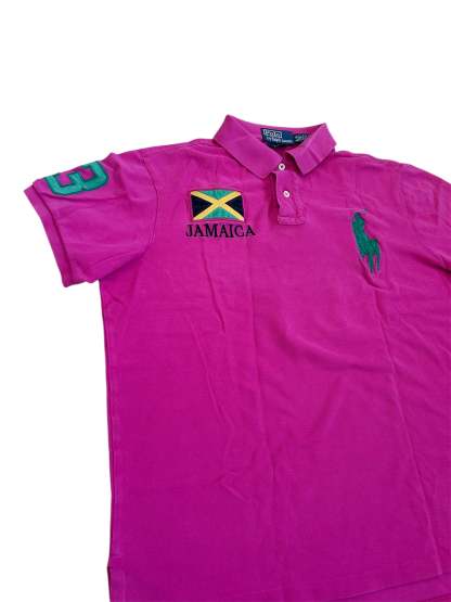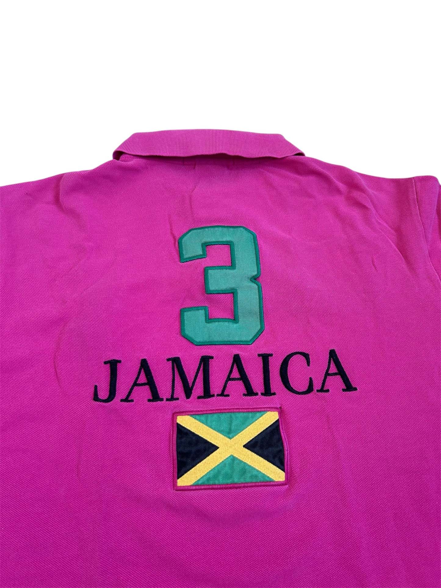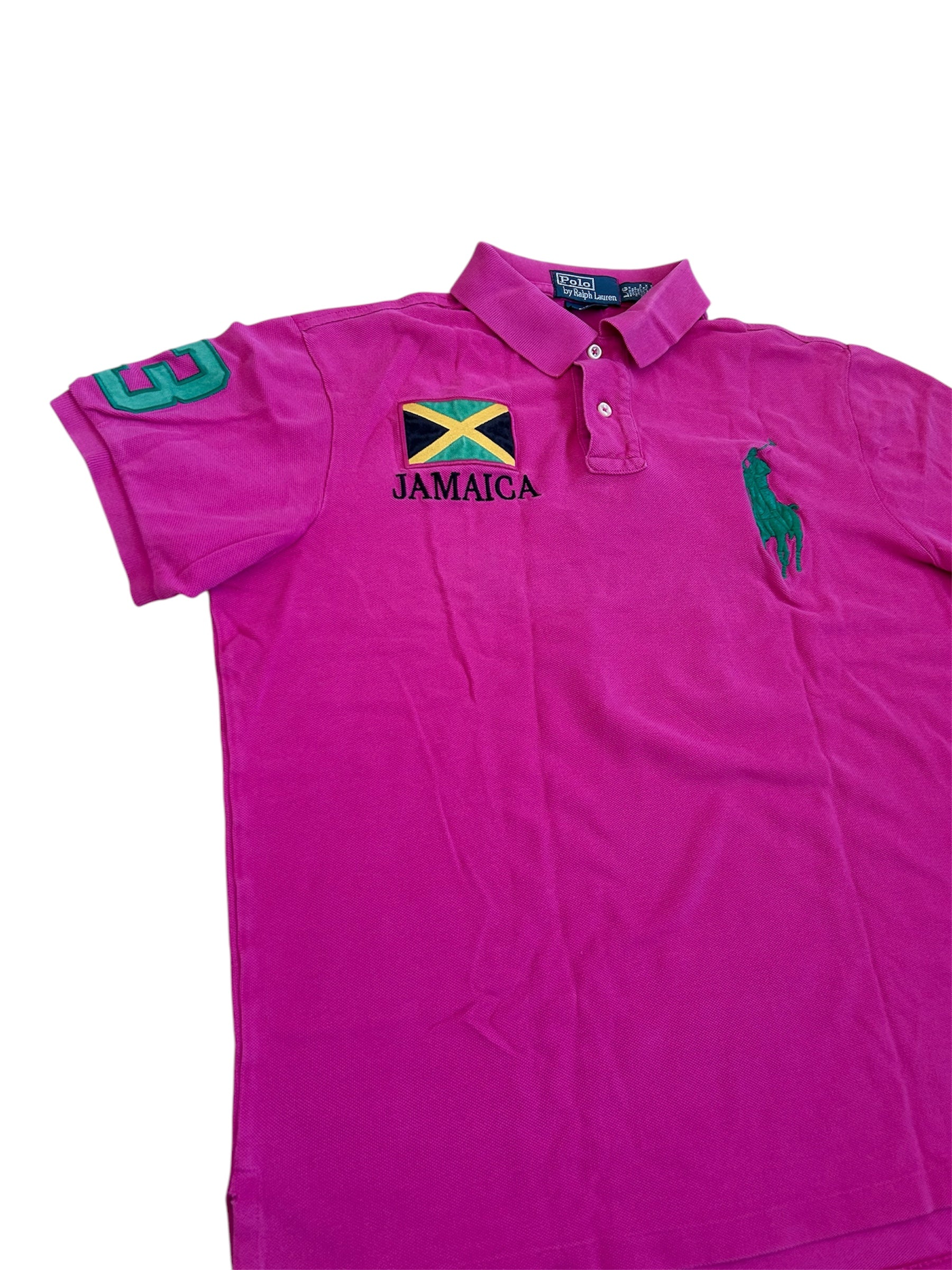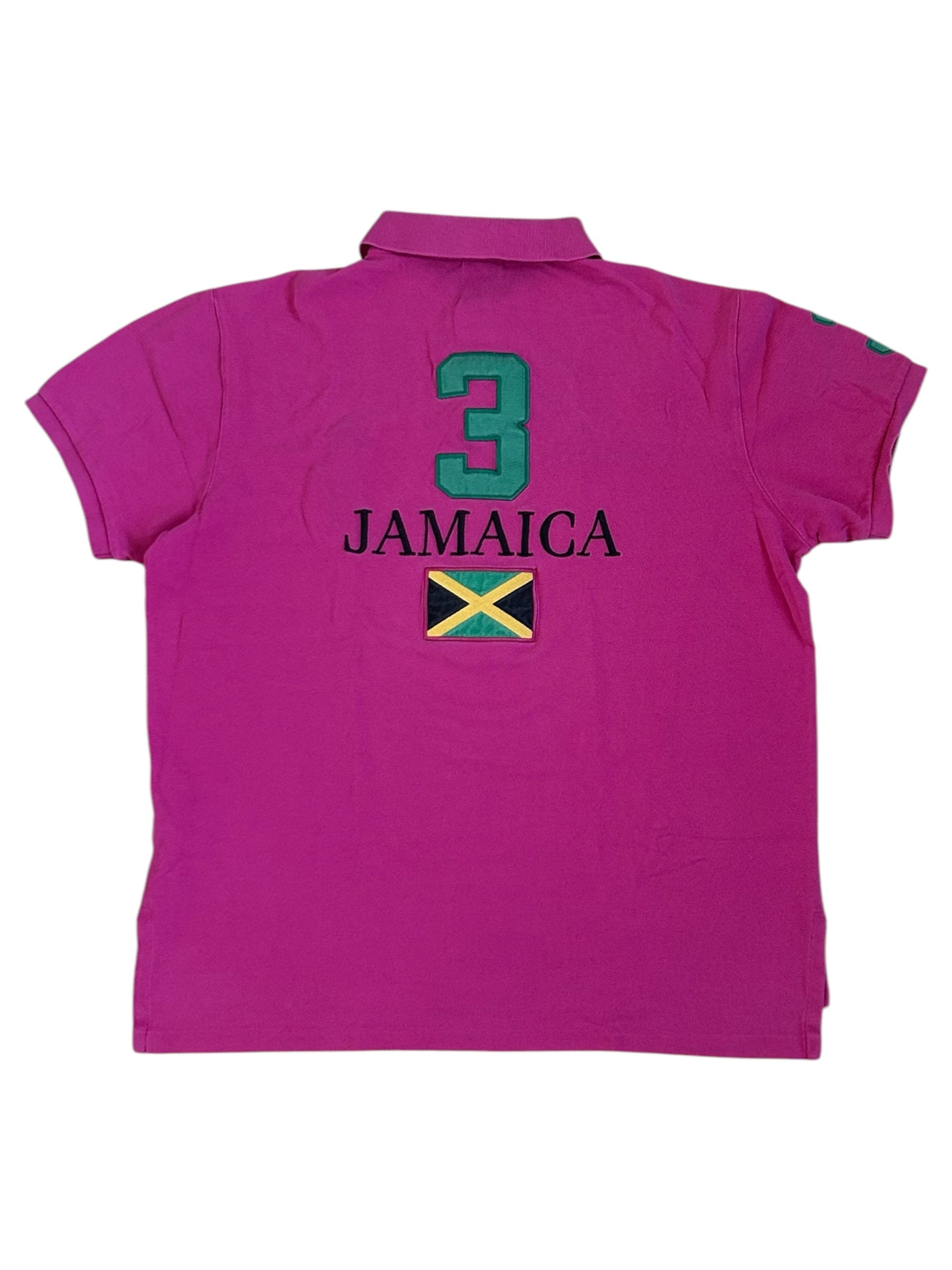 Made from 100% high-quality cotton, it features the Big Pony logo, bold "JAMAICA" lettering, an embroidered Jamaican flag, and the number 3 on the sleeve—a signature detail in Ralph Lauren’s polo designs. No longer in production, making it a rare and collectible item for Ralph Lauren enthusiasts.
