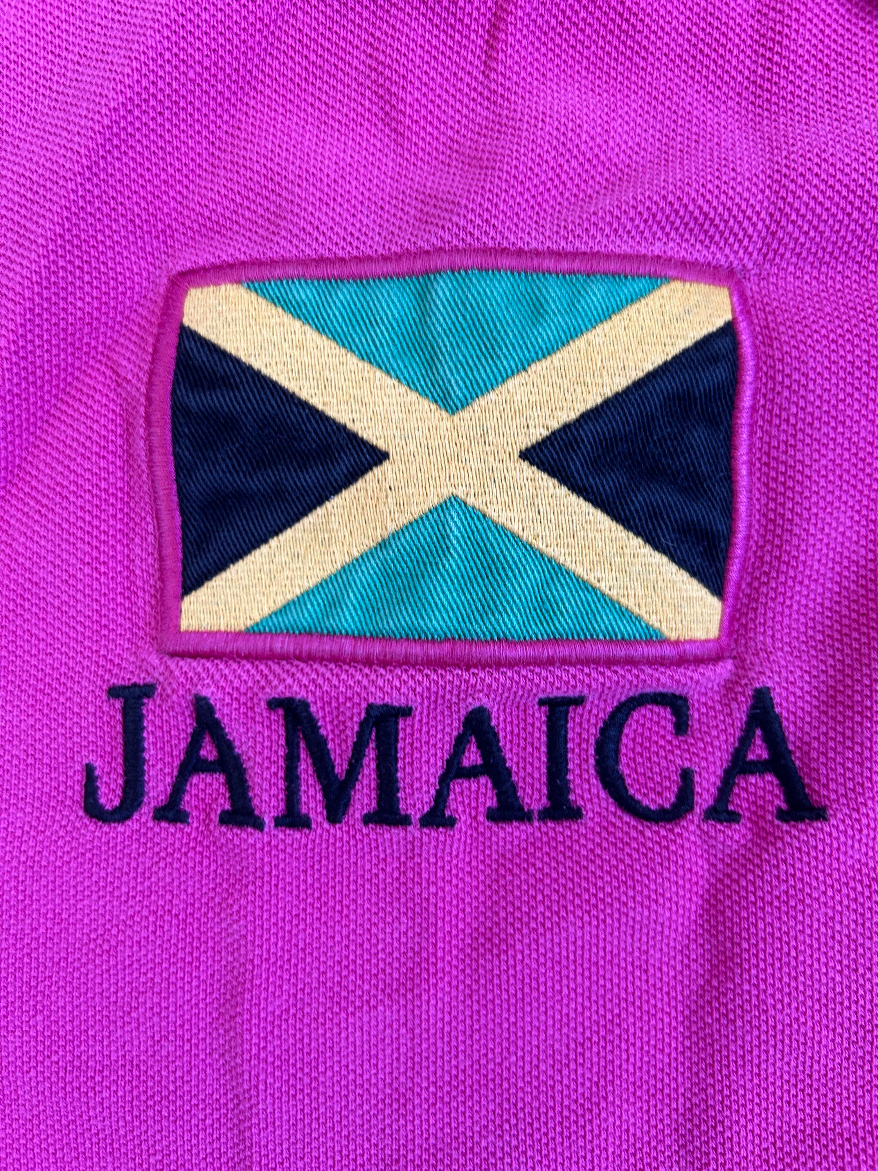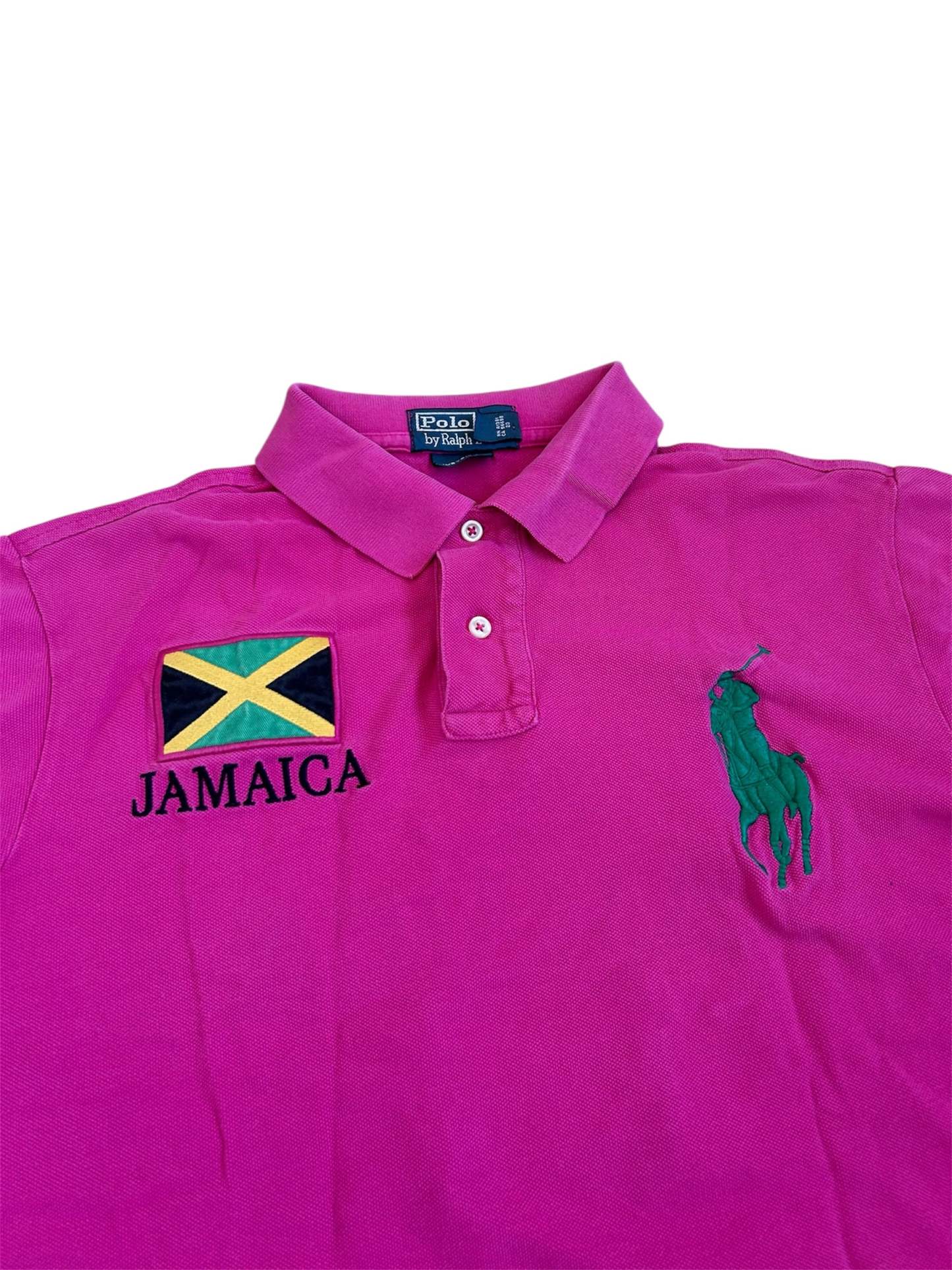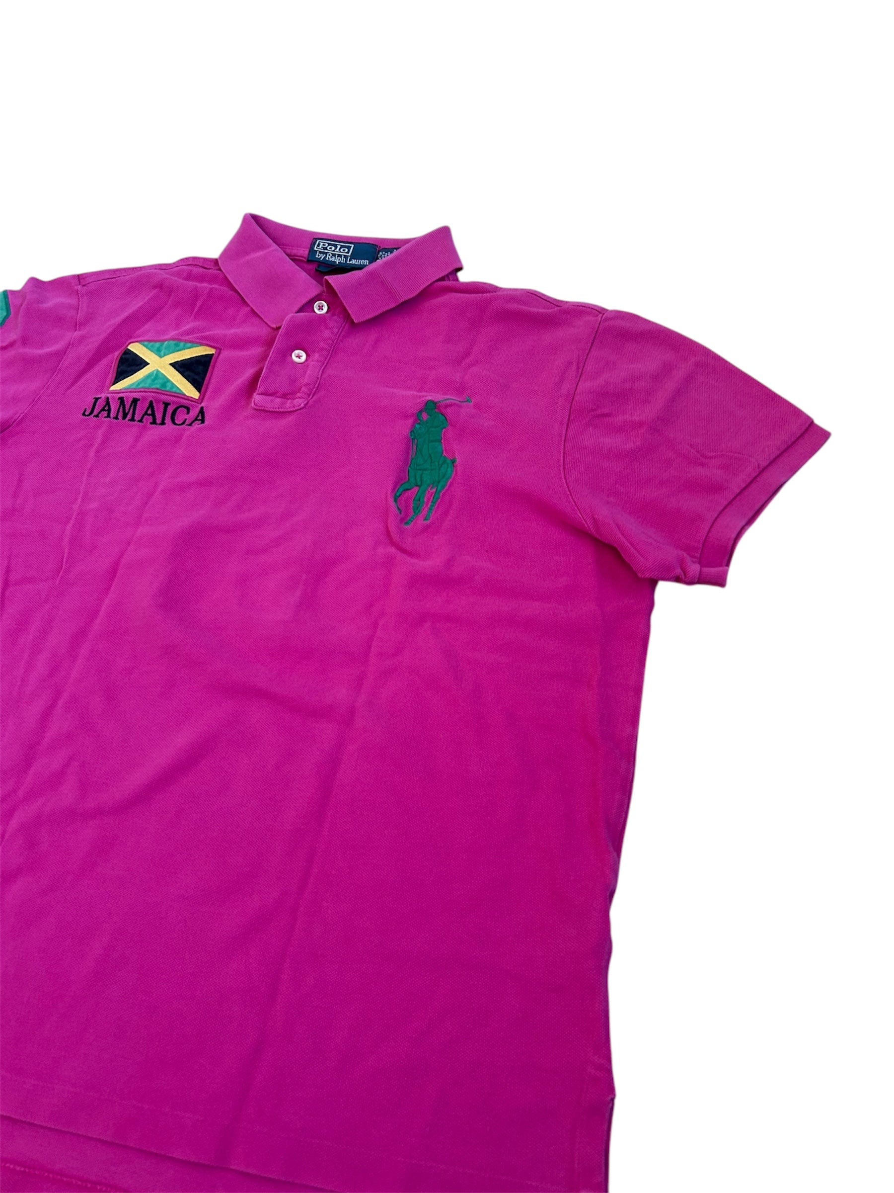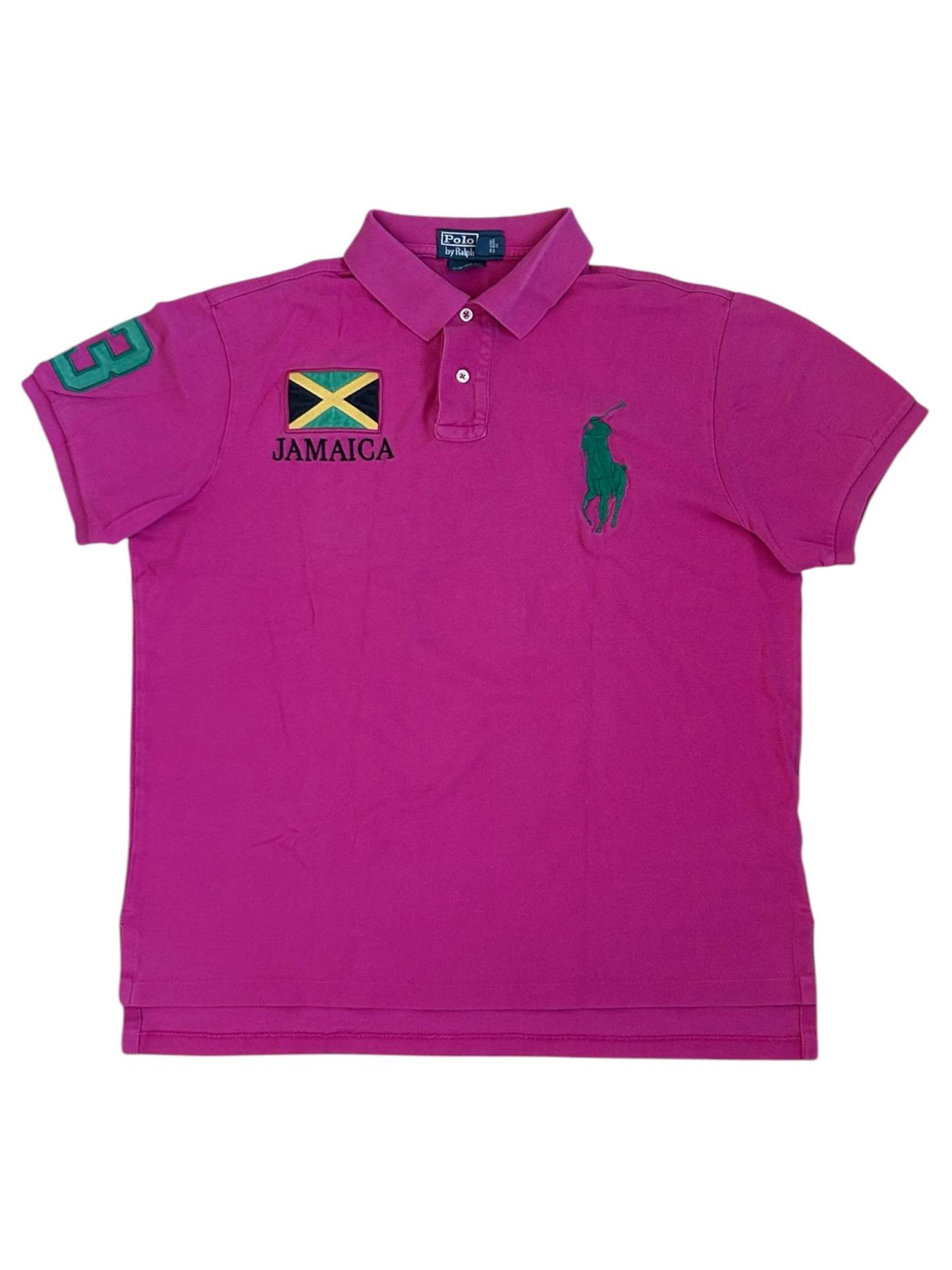 Made from 100% high-quality cotton, it features the Big Pony logo, bold "JAMAICA" lettering, an embroidered Jamaican flag, and the number 3 on the sleeve—a signature detail in Ralph Lauren’s polo designs. No longer in production, making it a rare and collectible item for Ralph Lauren enthusiasts.