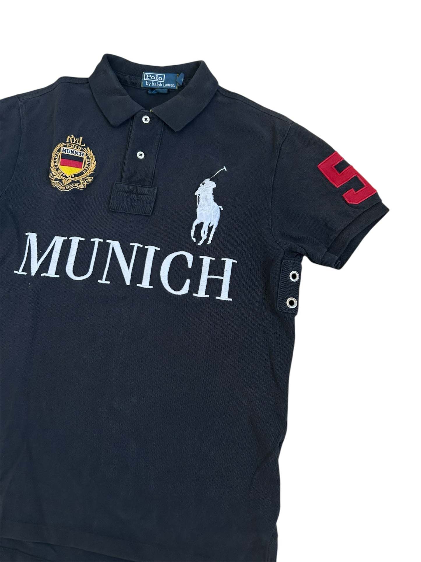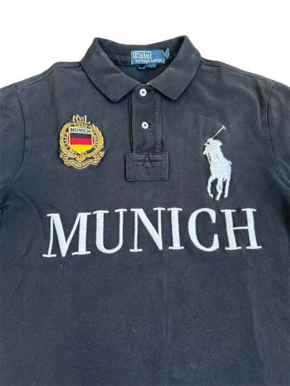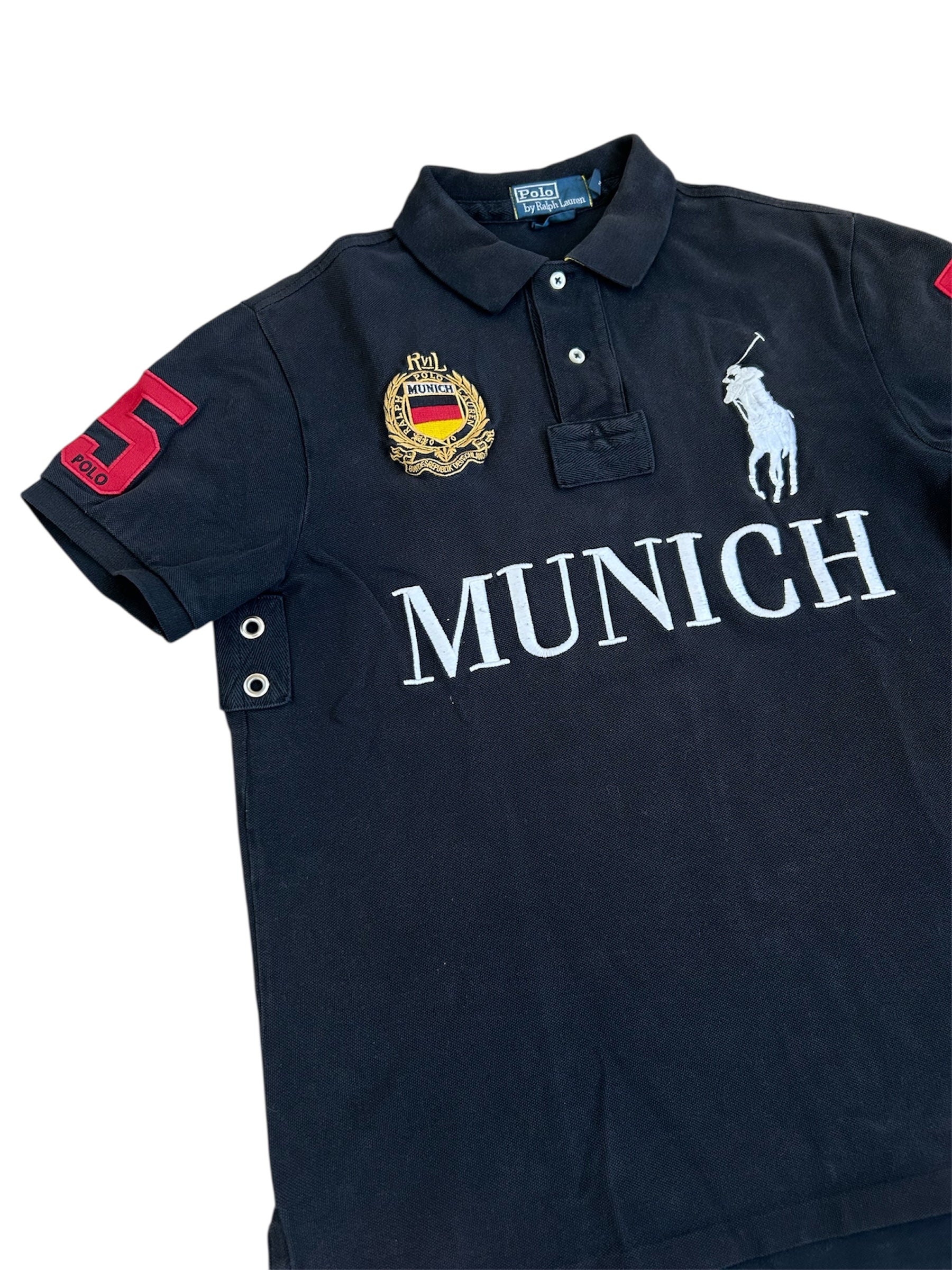 Made from 100% high-quality cotton, it features the Big Pony logo, bold "MUNICH" lettering, an embroidered Munich team crest, and the number 5 on both sleeves—a signature detail in Ralph Lauren’s polo designs. No longer in production, making it a rare and collectible item for Ralph Lauren enthusiasts.