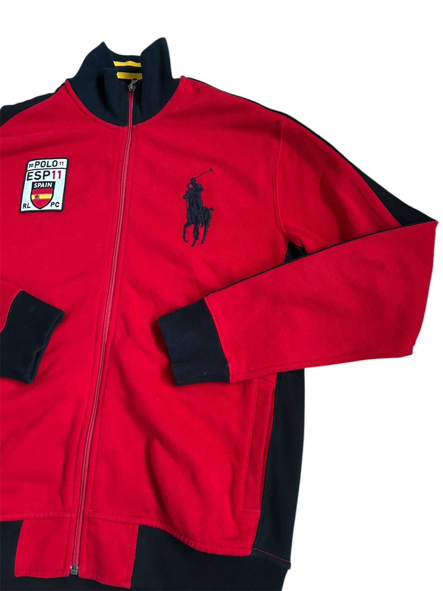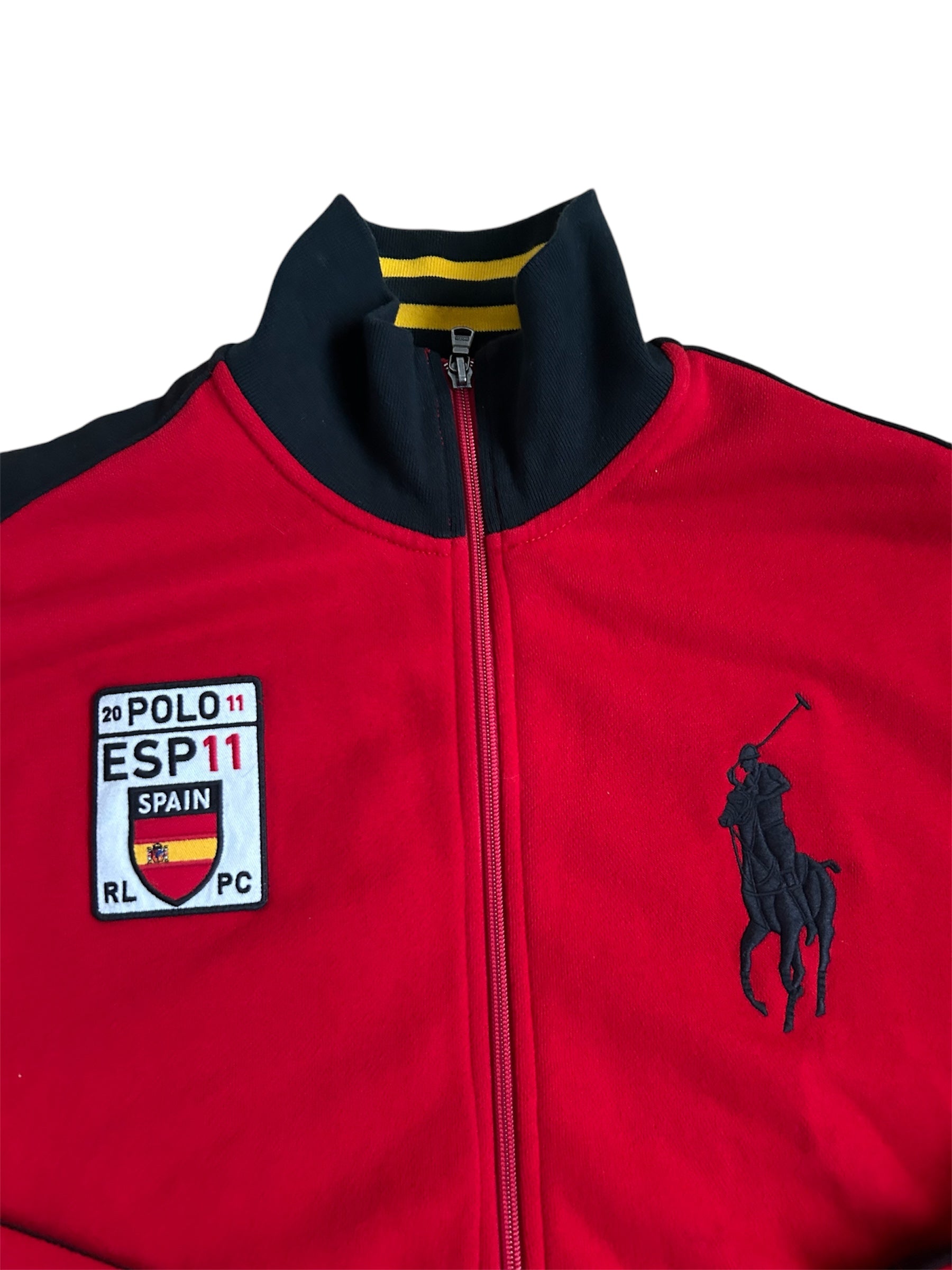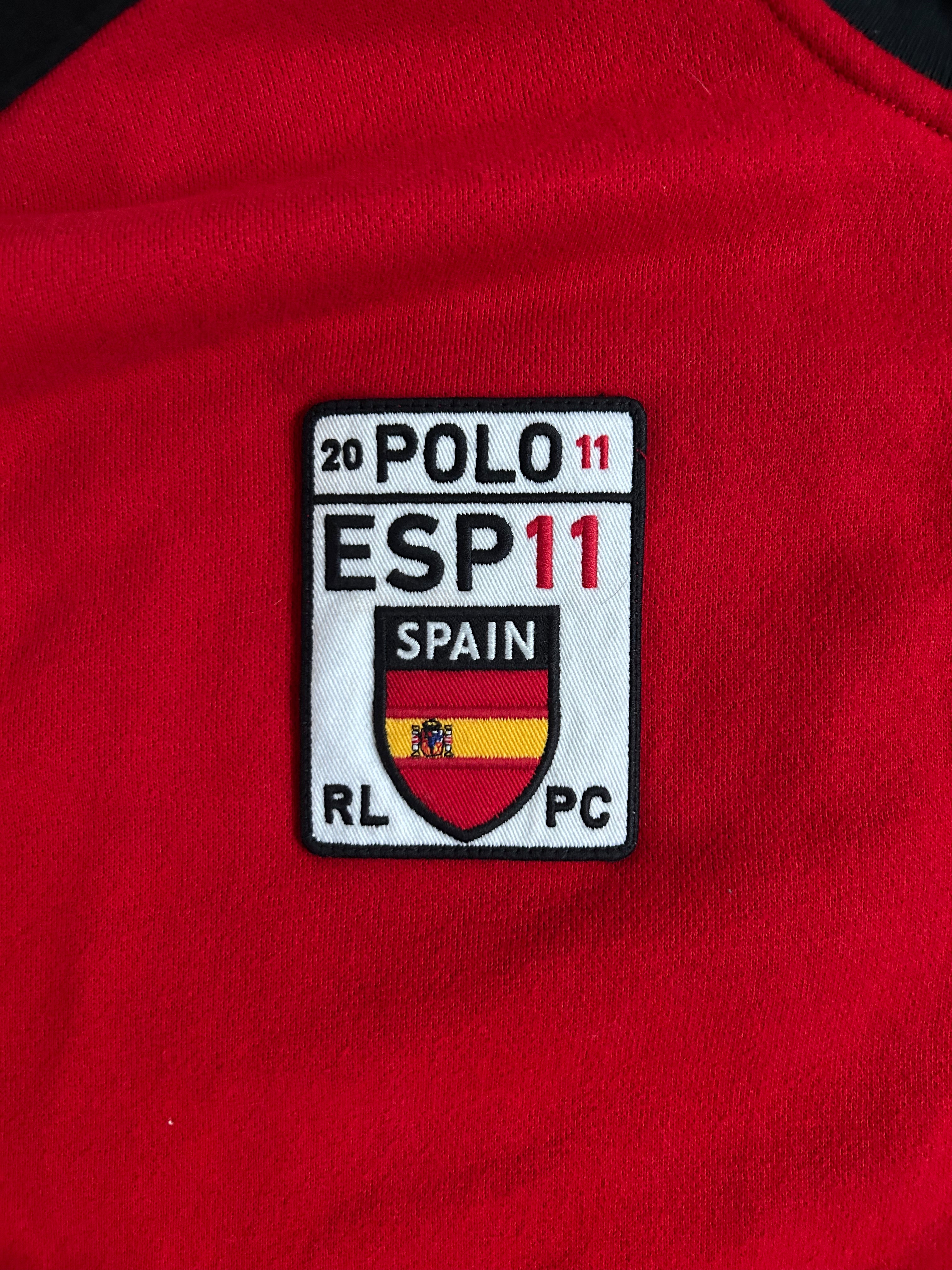 Crafted from high-quality cotton-blend fabric, it features the Big Pony logo, an embroidered "ESP 11" Spain team crest, and a full-zip design with a stand-up collar for a sporty yet sophisticated look. The red and black color combination adds a bold aesthetic, while the ribbed cuffs and hem ensure a comfortable fit. No longer in production, making it a rare and collectible item for Ralph Lauren enthusiasts.