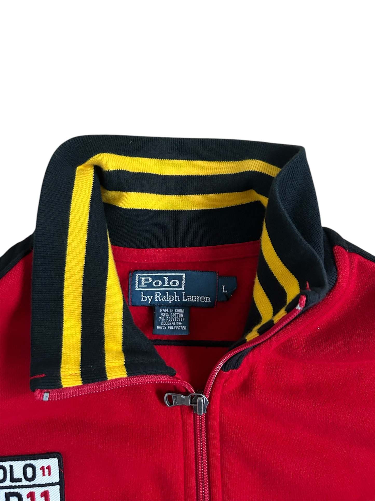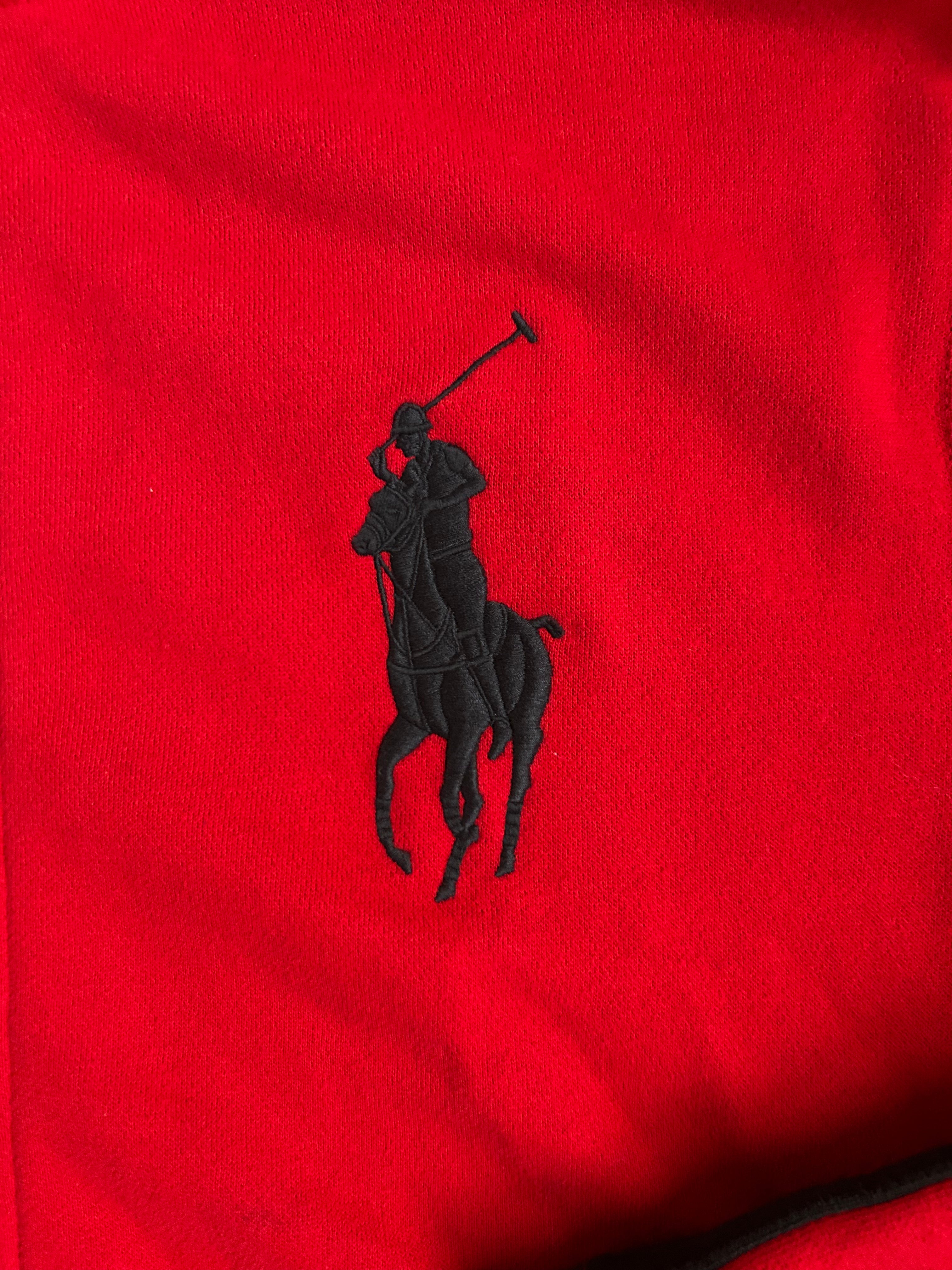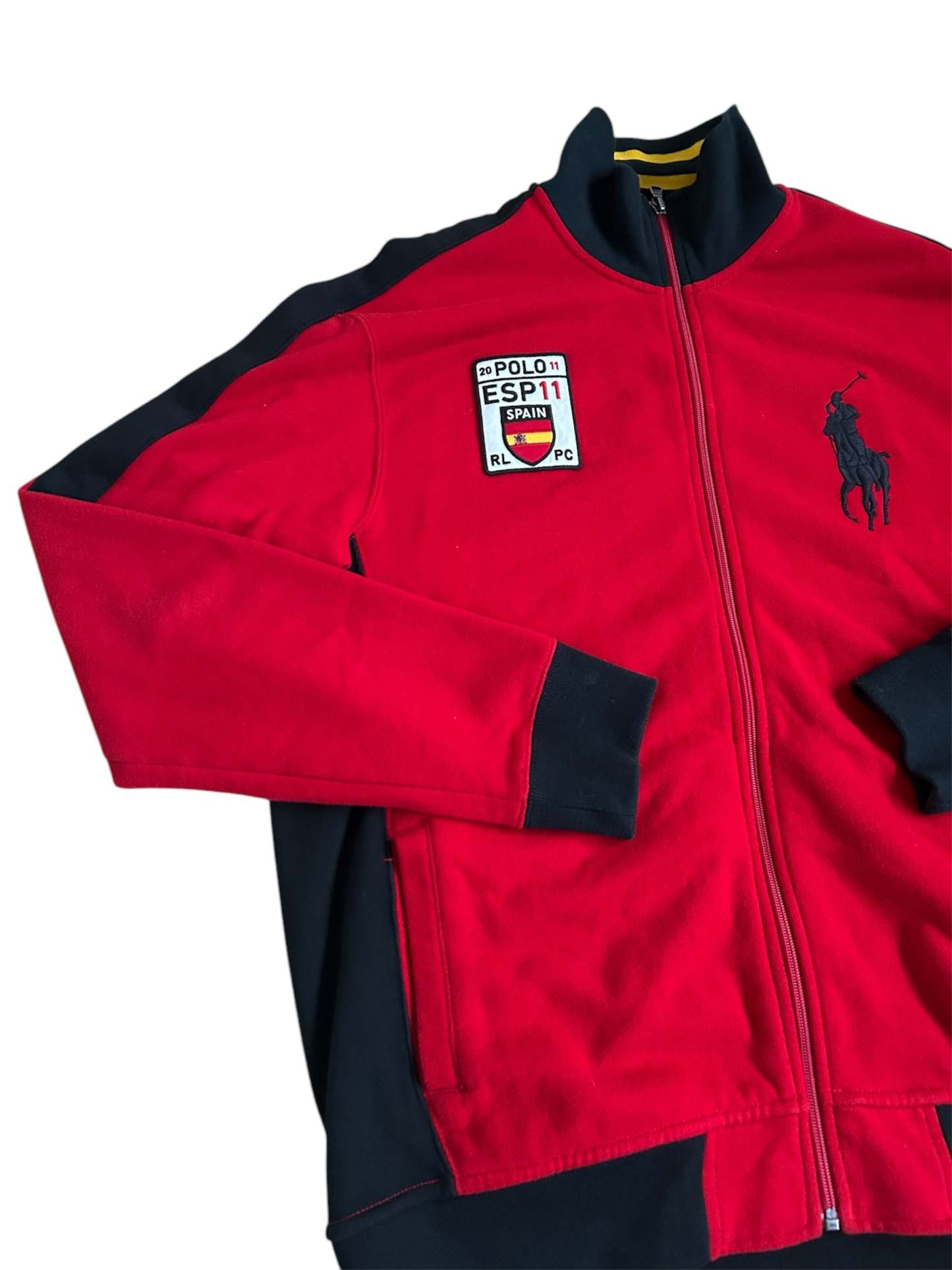 Crafted from high-quality cotton-blend fabric, it features the Big Pony logo, an embroidered "ESP 11" Spain team crest, and a full-zip design with a stand-up collar for a sporty yet sophisticated look. The red and black color combination adds a bold aesthetic, while the ribbed cuffs and hem ensure a comfortable fit. No longer in production, making it a rare and collectible item for Ralph Lauren enthusiasts.