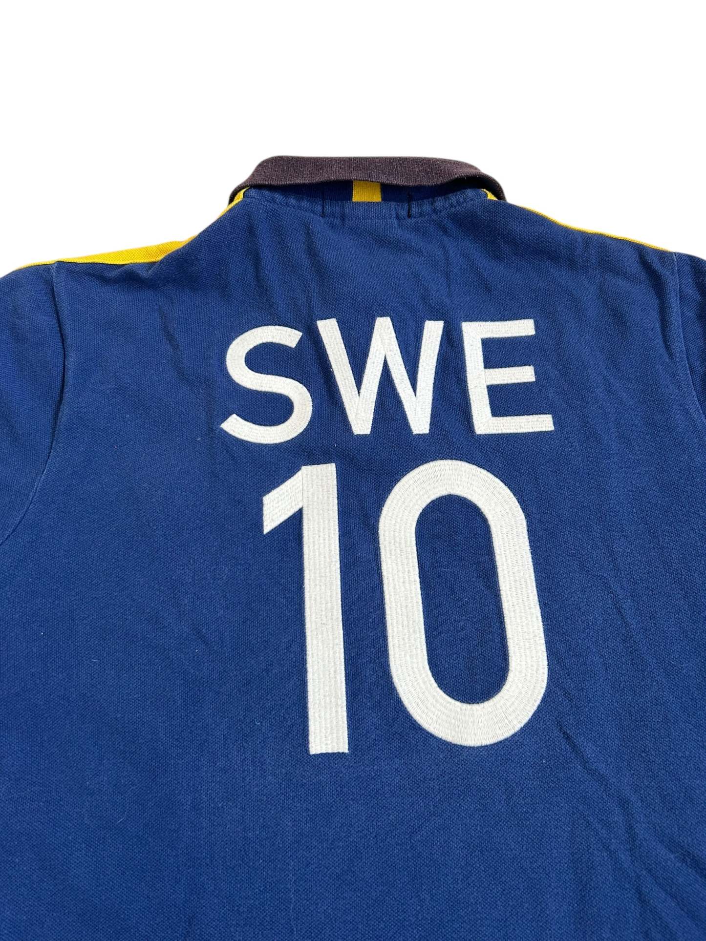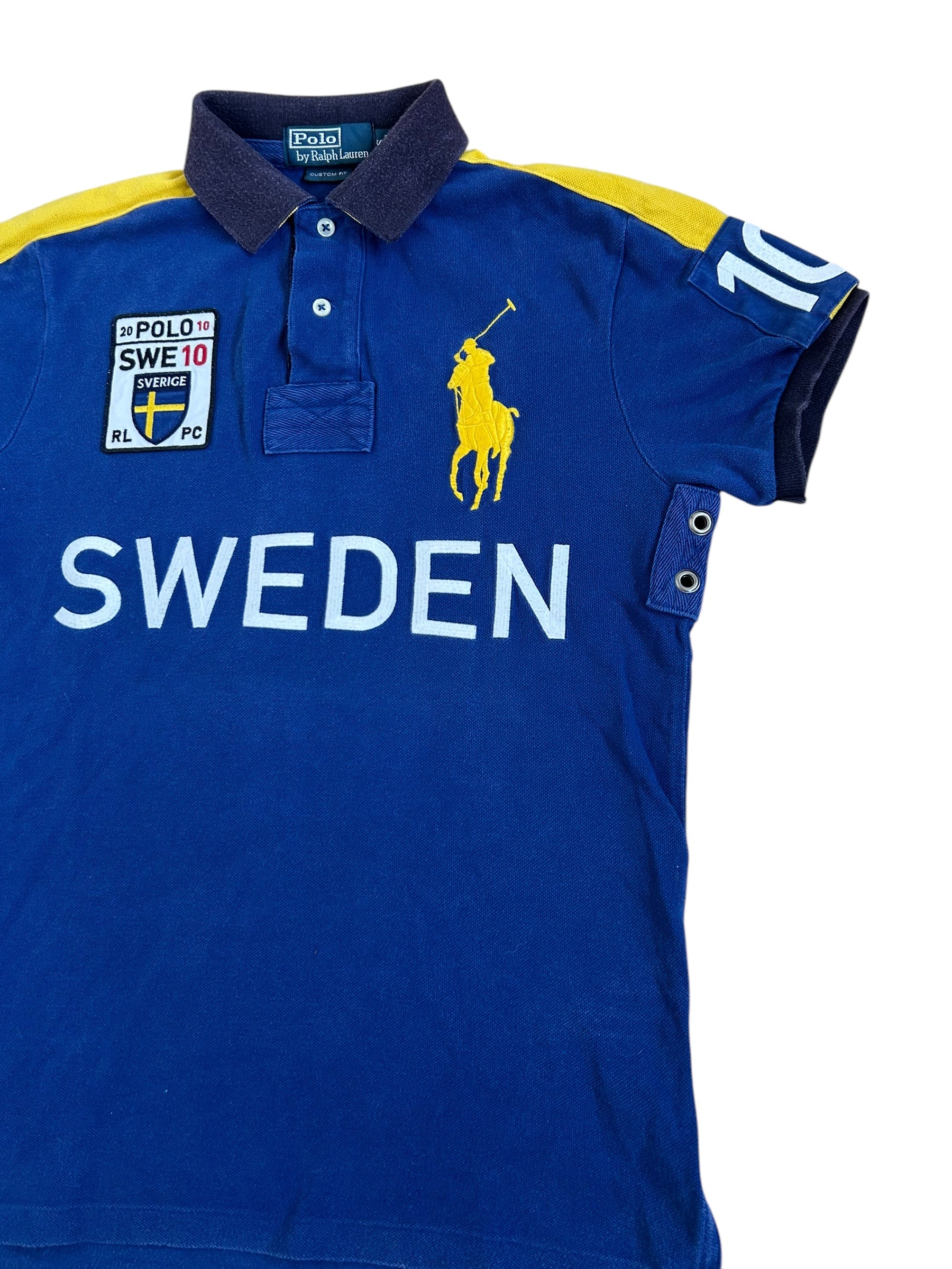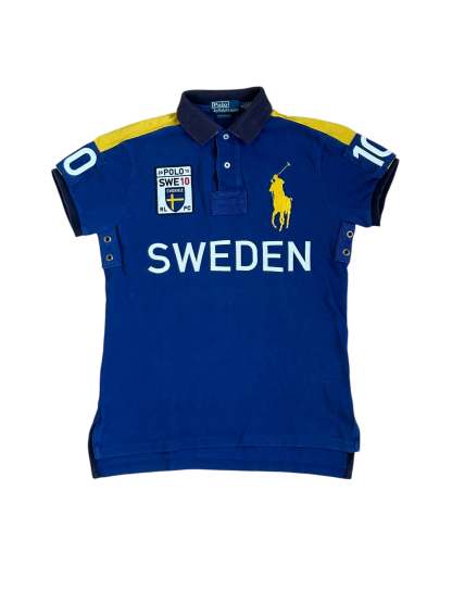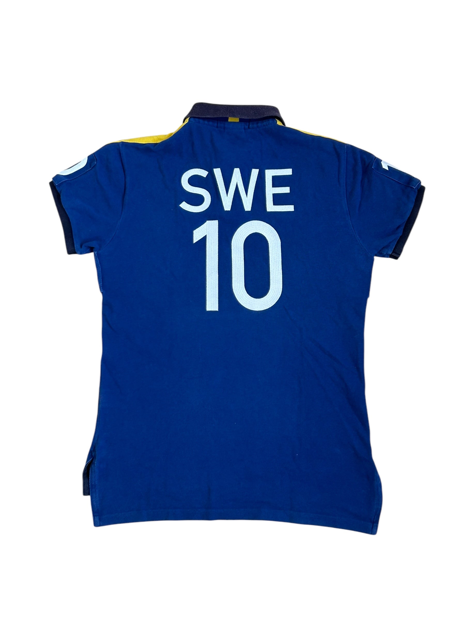 Made from 100% high-quality cotton, it features the Big Pony logo, bold "SWEDEN" lettering, an embroidered Sweden team crest, and the number 10 on both sleeves—a signature detail in Ralph Lauren’s polo designs. No longer in production, making it a rare and collectible item for Ralph Lauren enthusiasts.