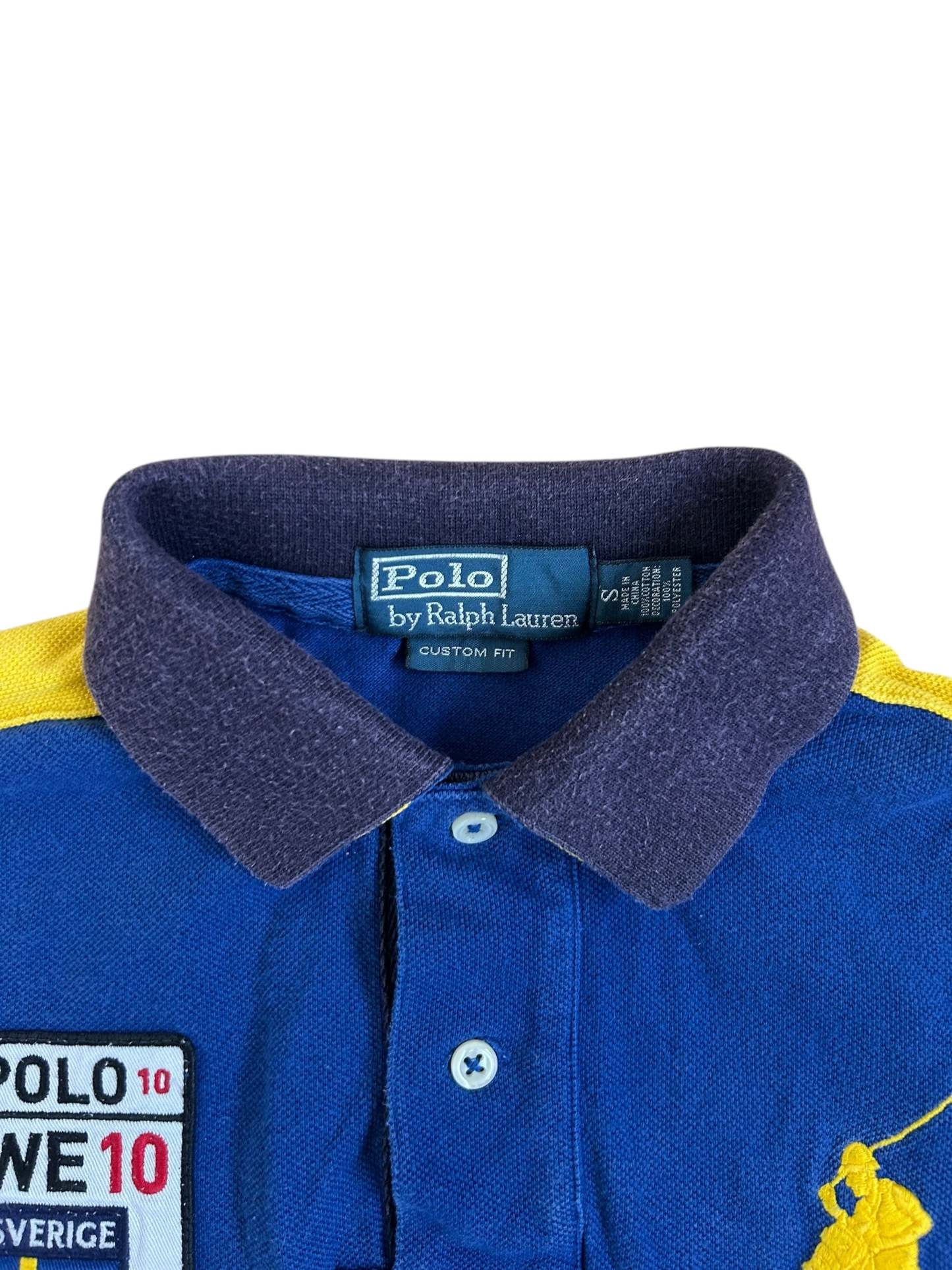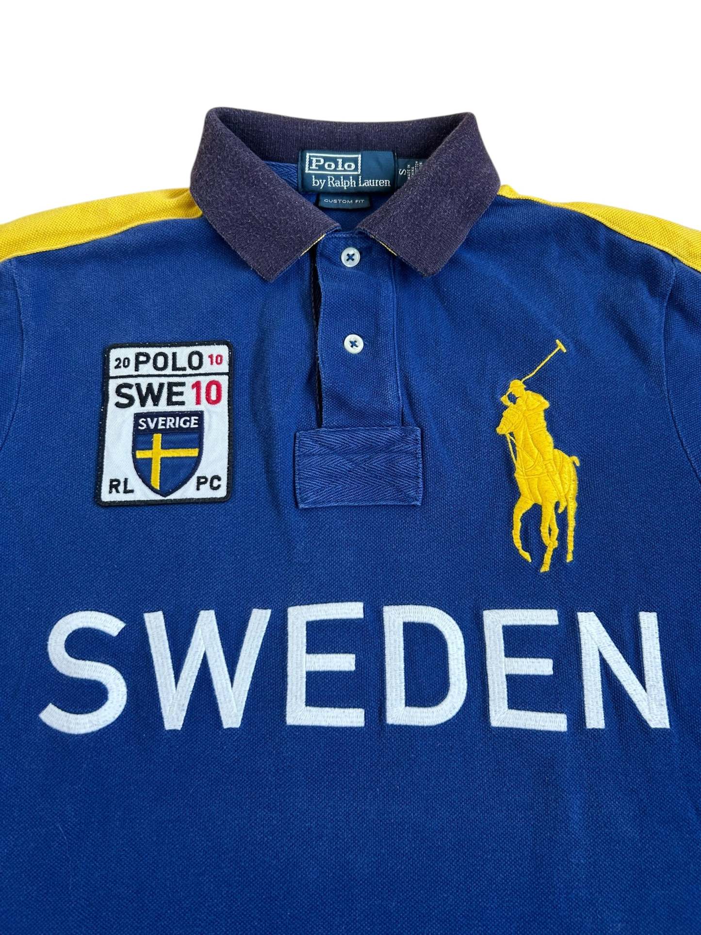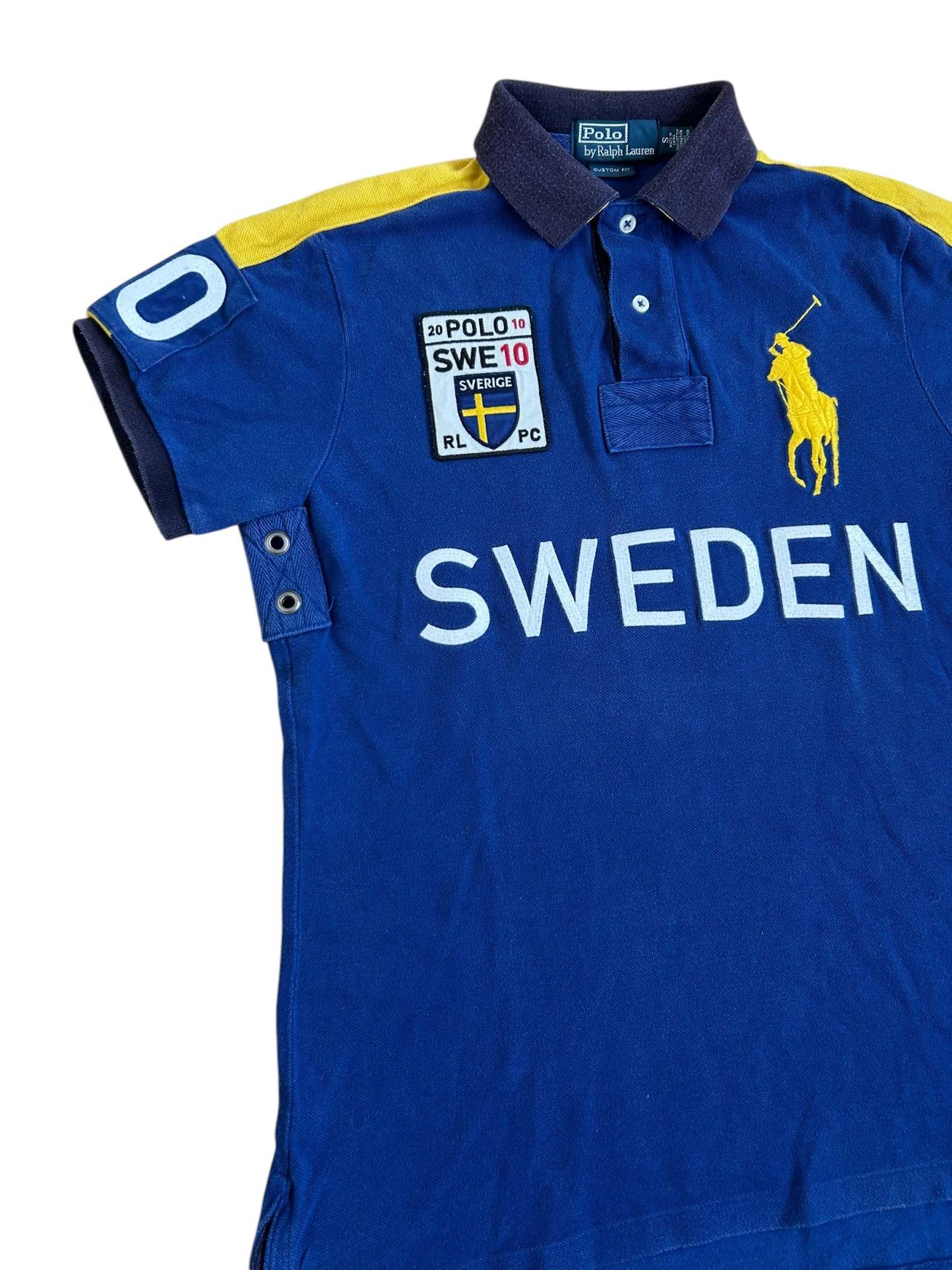 Made from 100% high-quality cotton, it features the Big Pony logo, bold "SWEDEN" lettering, an embroidered Sweden team crest, and the number 10 on both sleeves—a signature detail in Ralph Lauren’s polo designs. No longer in production, making it a rare and collectible item for Ralph Lauren enthusiasts.