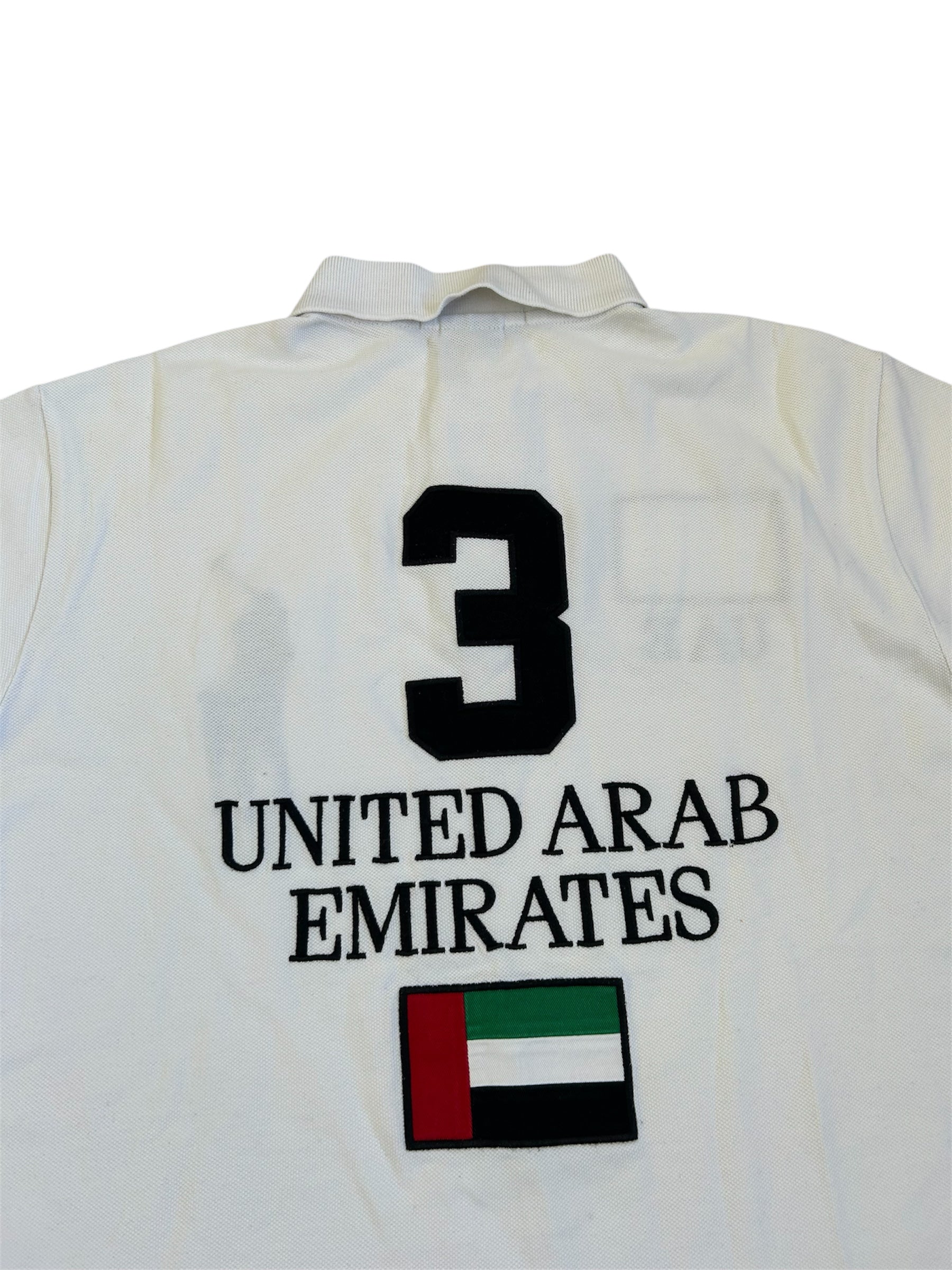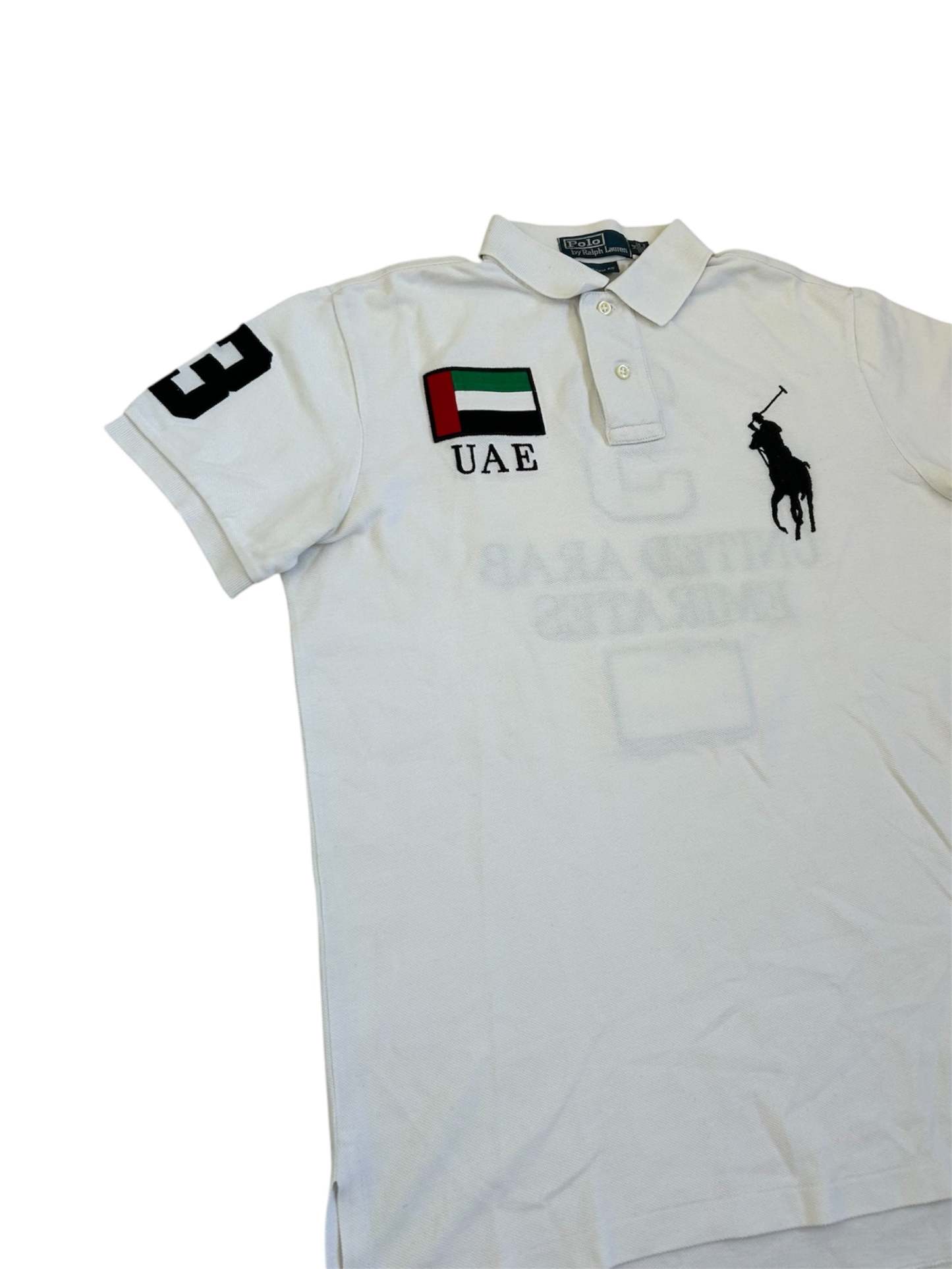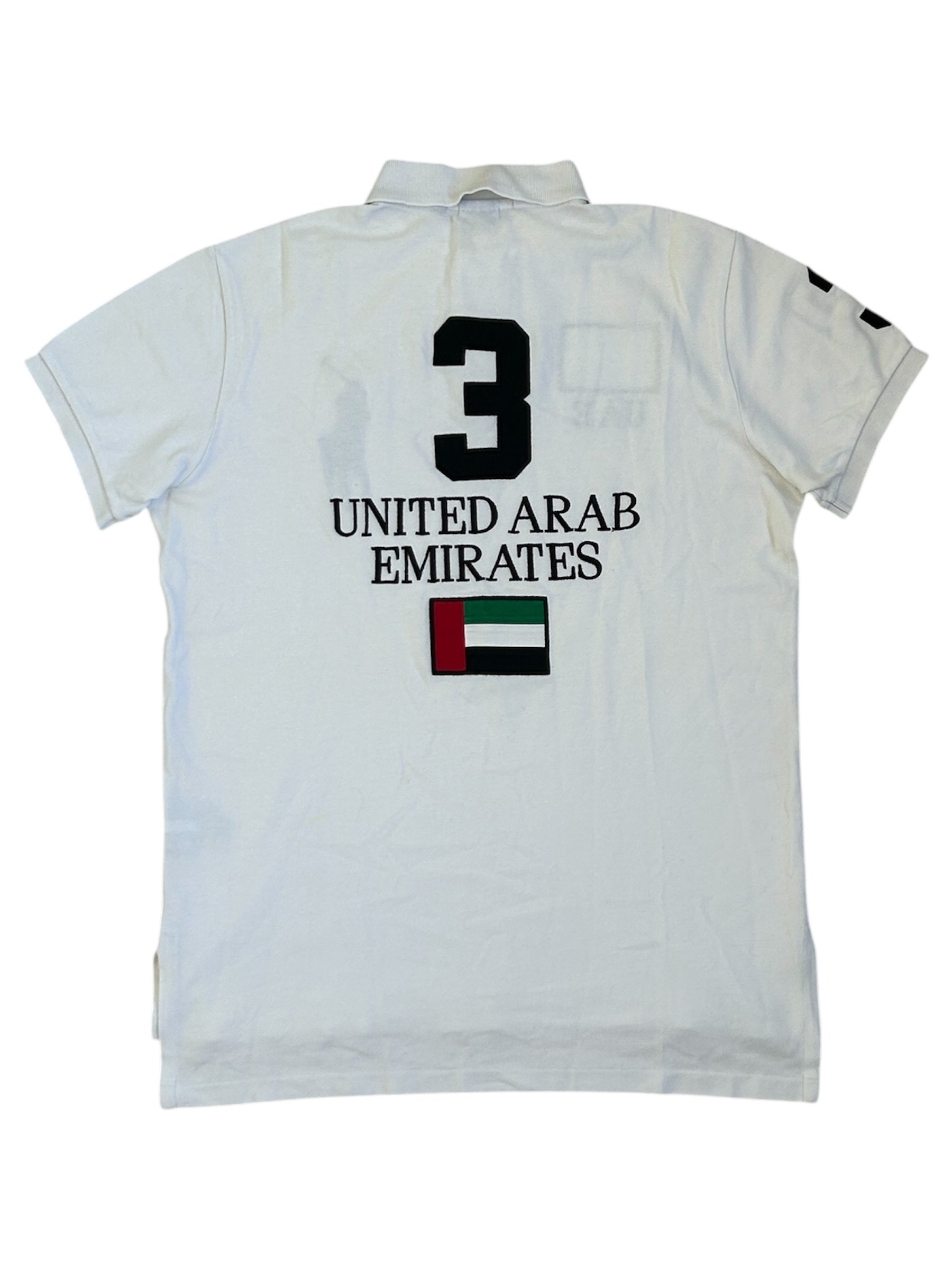 Made from 100% high-quality cotton, it features the Big Pony logo, bold "UAE" lettering, an embroidered UAE flag patch, and the number 3 on the sleeve—a signature detail in Ralph Lauren’s polo designs. No longer in production, making it a rare and collectible item for Ralph Lauren enthusiasts.
