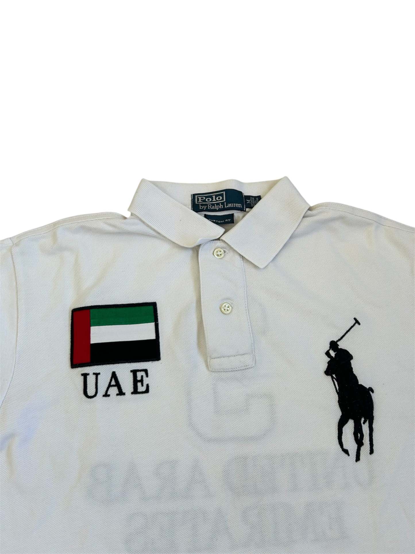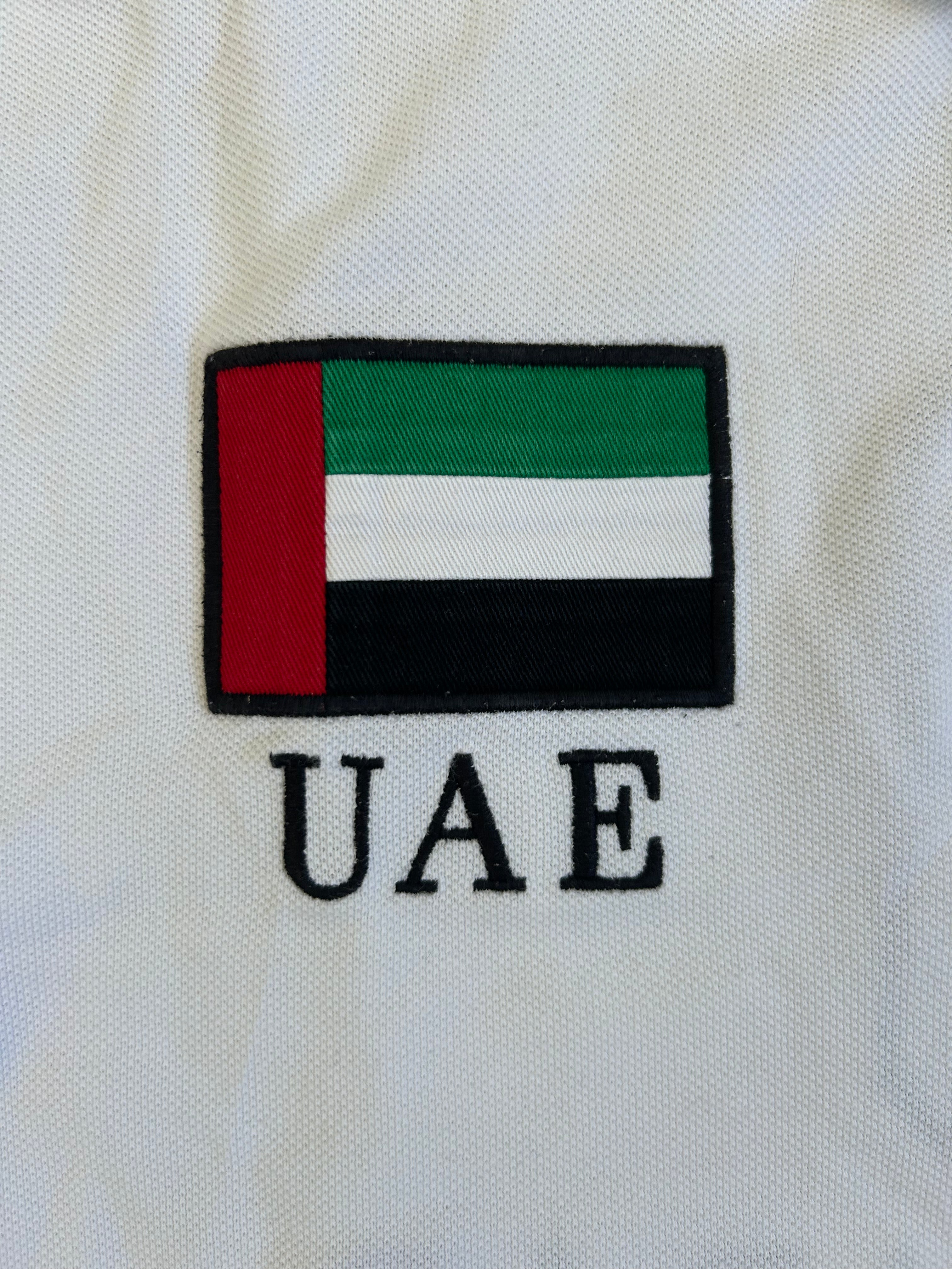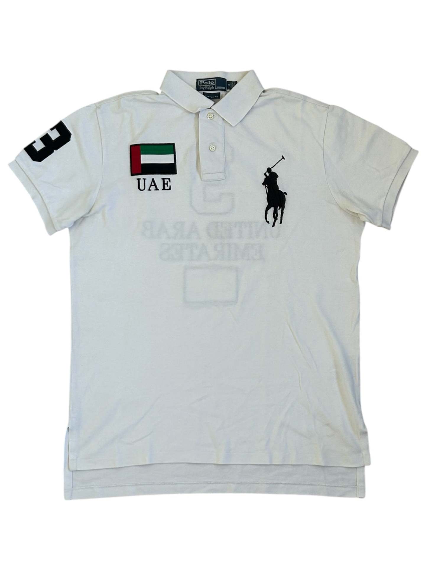 Made from 100% high-quality cotton, it features the Big Pony logo, bold "UAE" lettering, an embroidered UAE flag patch, and the number 3 on the sleeve—a signature detail in Ralph Lauren’s polo designs. No longer in production, making it a rare and collectible item for Ralph Lauren enthusiasts.